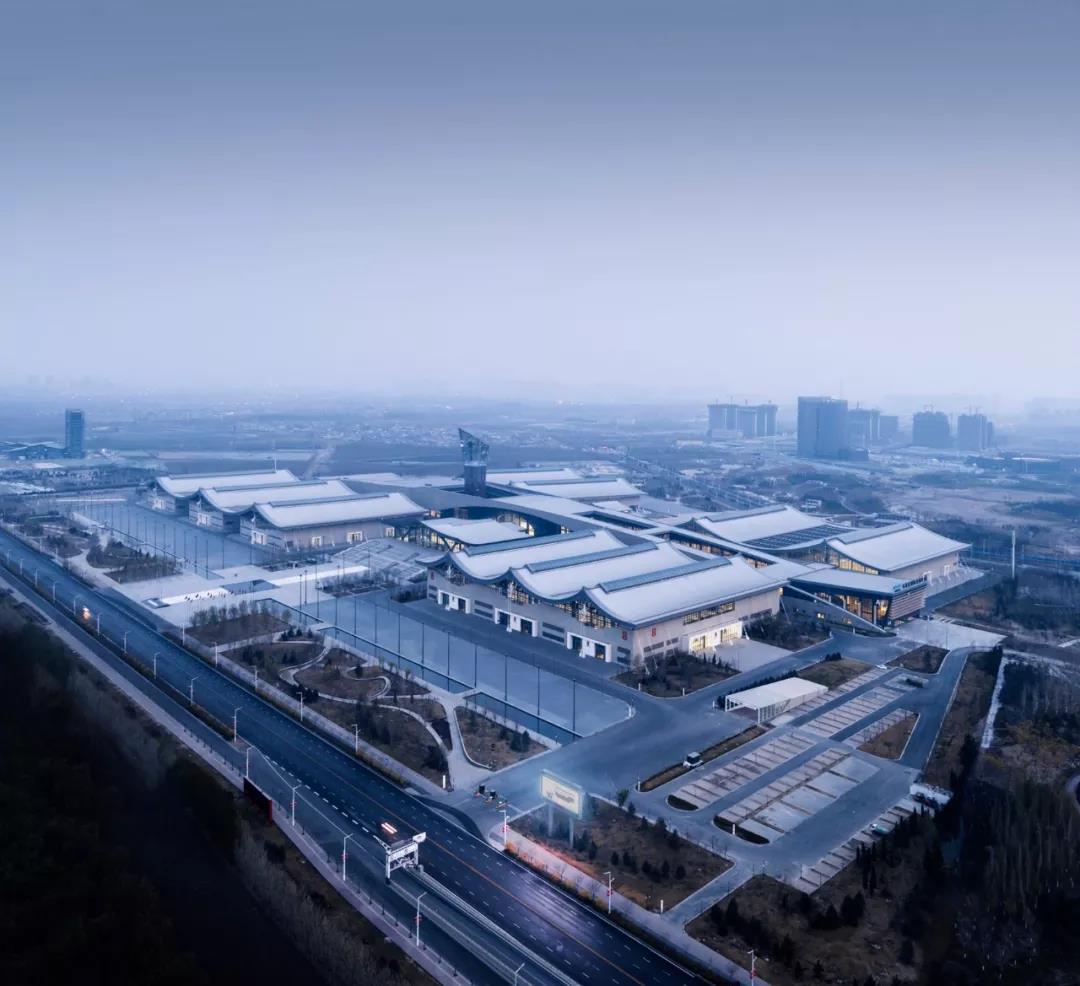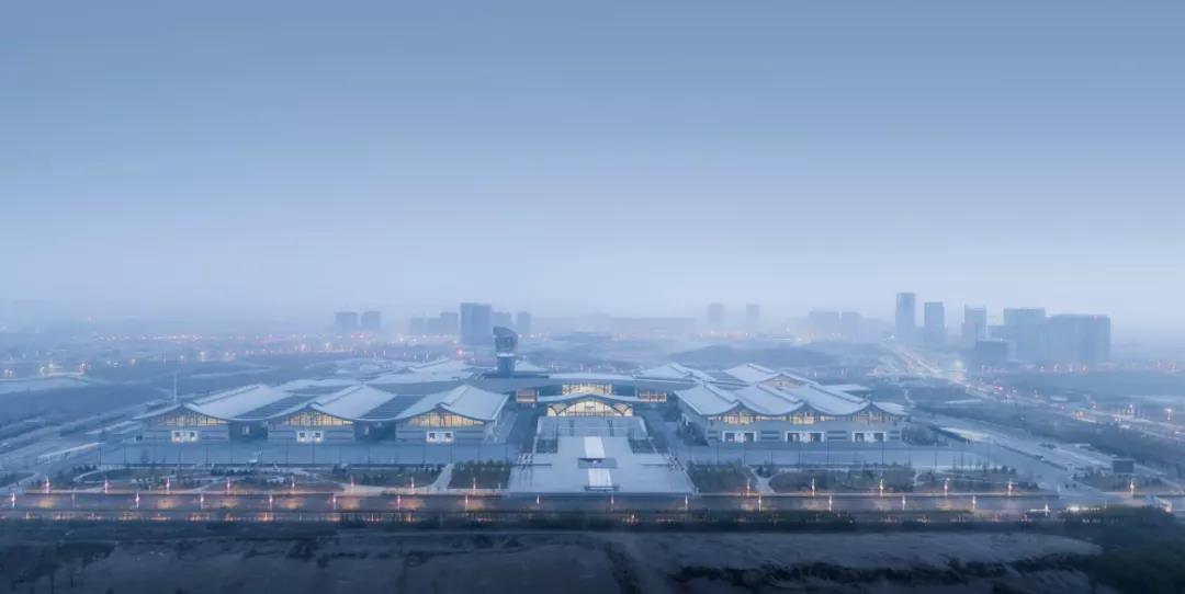 石家莊國際會展中心位于石家莊市正定新區,總用地面積64.4公頃。項目總建筑面積35.9萬平方米,其中地上22.9萬平方米。由中央樞紐區串聯會議和展覽各個部分,呈魚骨式展開。多標高步行系統實現人、車、貨分流。展覽部分包含七個面積1.1萬平方米標準展廳和一個面積2.6萬平方米的大型多功能展廳。總體展覽建筑面積達11萬平方米,是目前建成的世界最大懸索結構展廳。