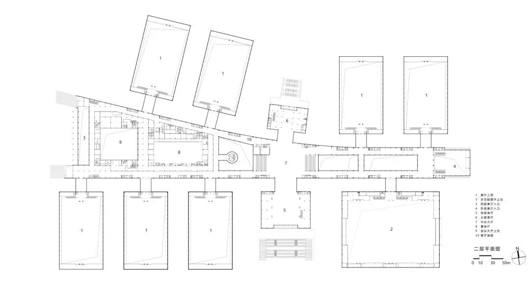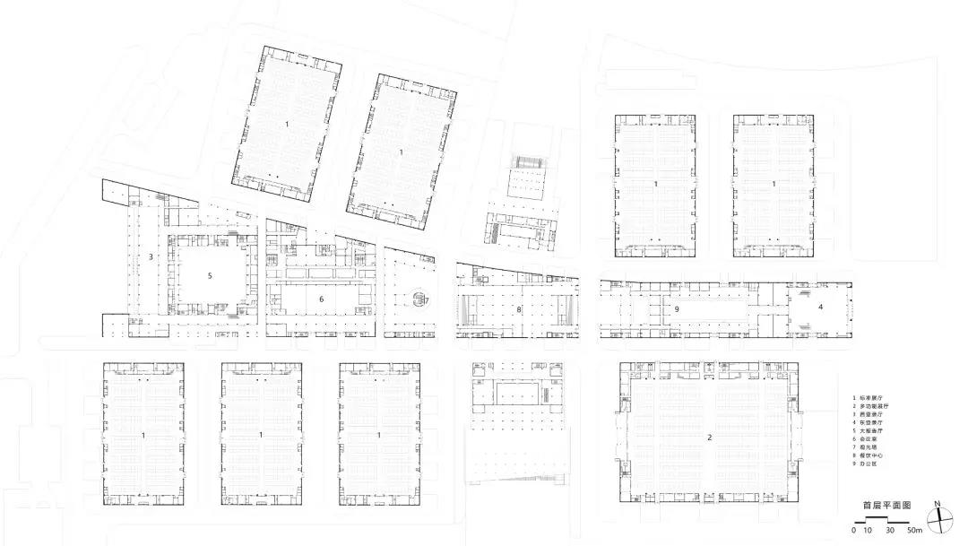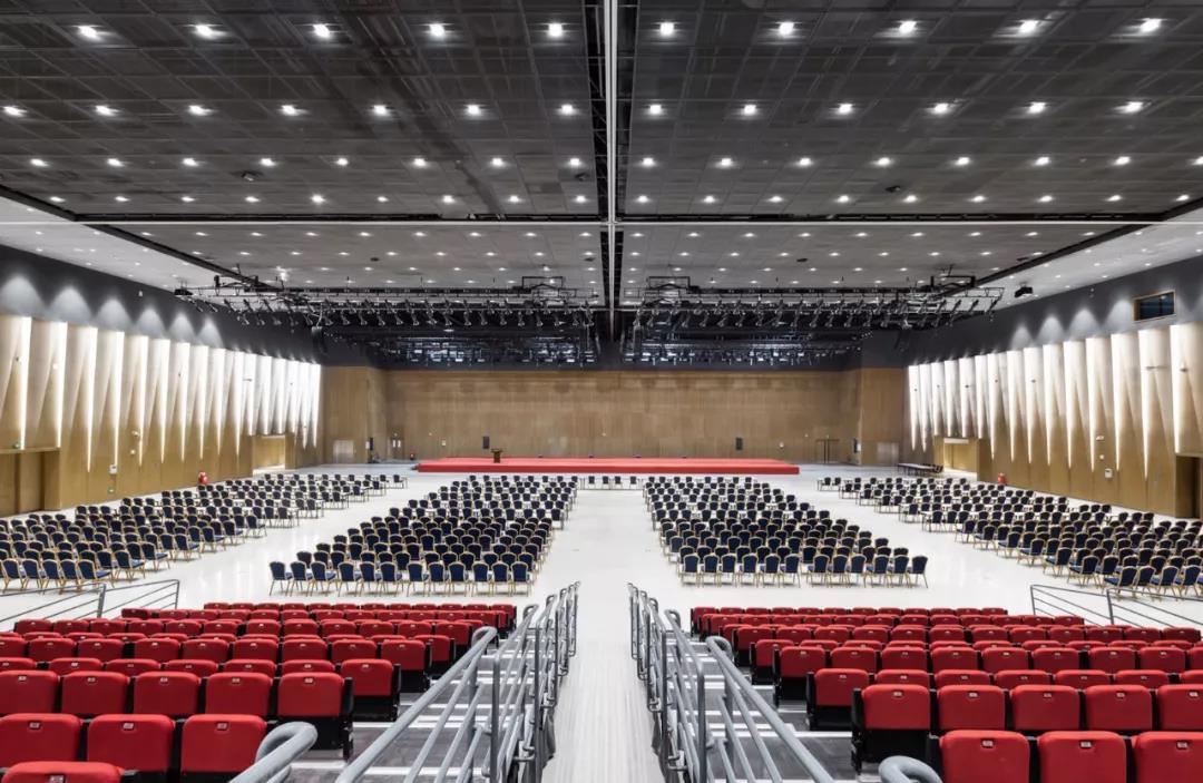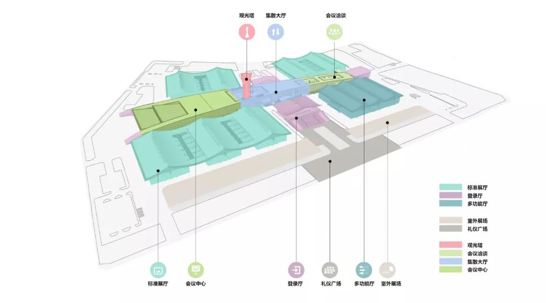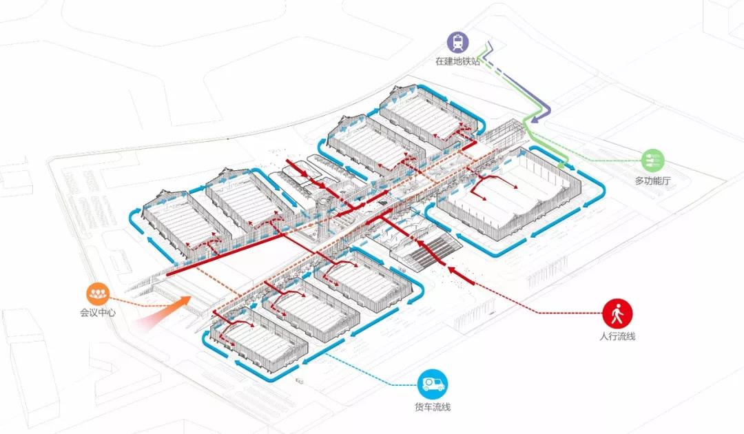 2、靈活高效的功能組合。建筑設置多標高平臺系統,供貨線路與人行流線互不交叉。展廳沿樞紐區魚骨式生長,兩三成組。既能保持整體運營的連貫性,又相對成組團獨立對外經營。設置一個相對獨立的2.6萬m2多功能展廳,承擔包括展覽、會議、演藝、賽事等功能。大觀演廳采用無固定坐席布置,后排設置少量活動座椅,可根據需要分隔成2-4個小廳。約3000m2大宴會廳也可以分隔為3個小廳獨立運營。