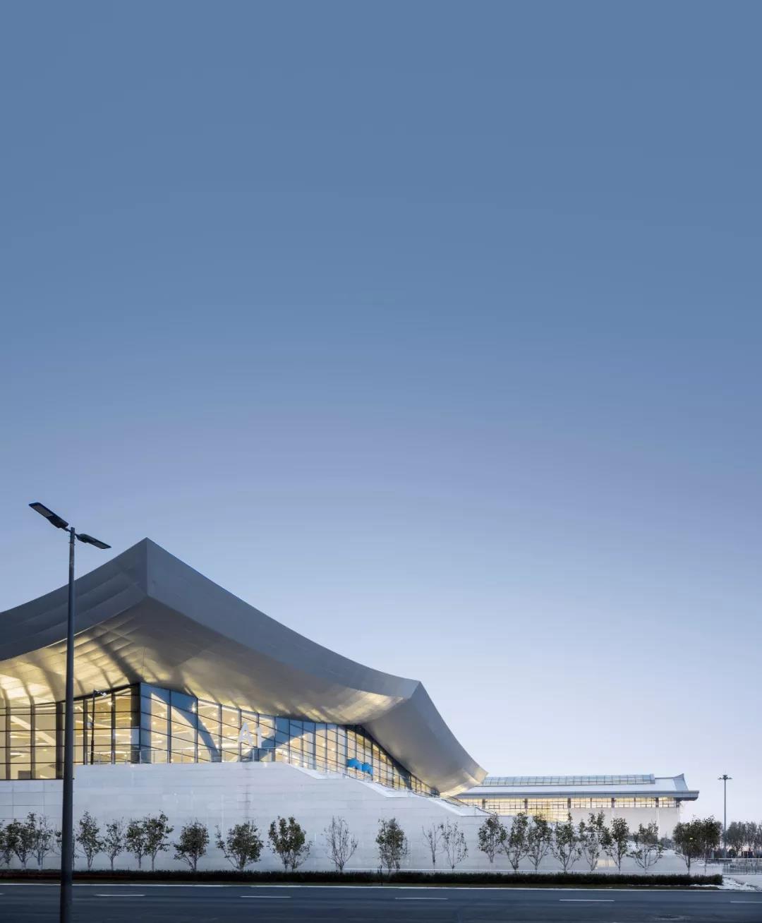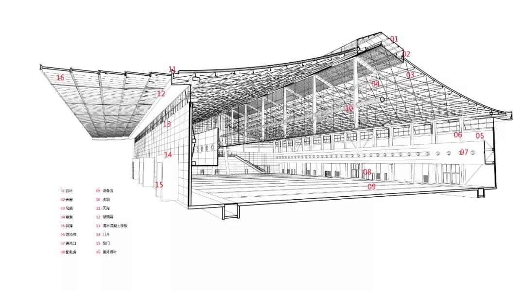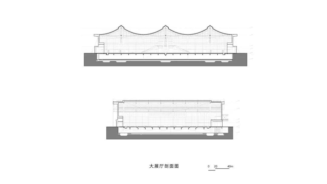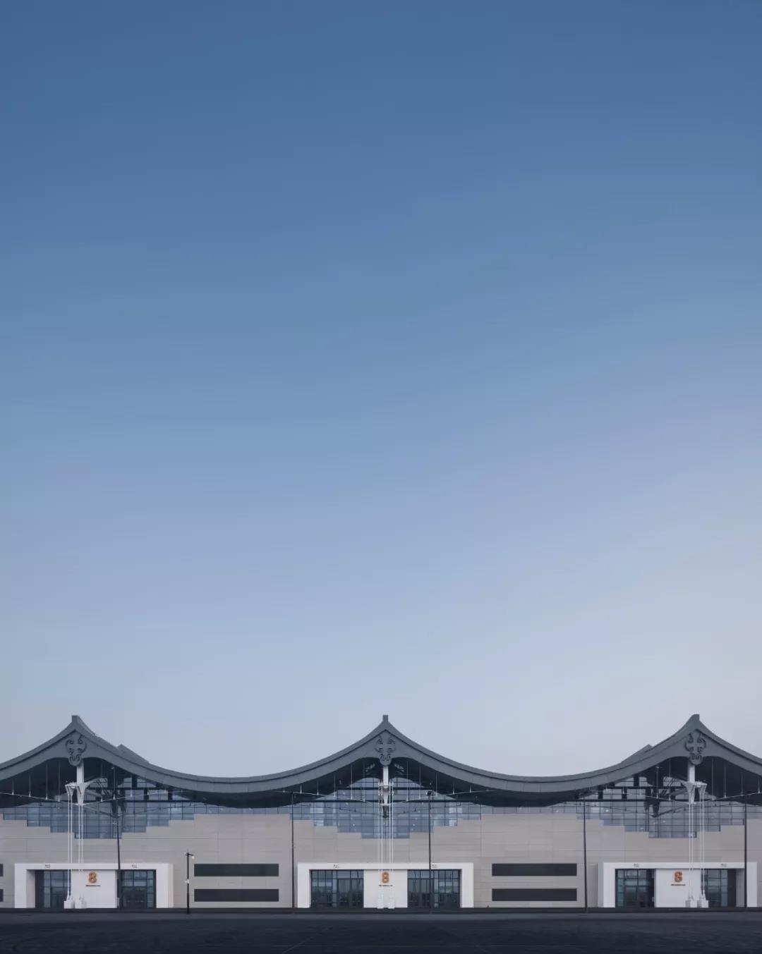 4、由懸索結構自然形成的大屋面形成對傳統建筑的強烈映射,同時在展廳山墻面細部抽取借鑒正定縣隆興寺摩尼殿歇山抱廈意象,用新材料新技術呈現幾何力學和建筑美學的統一,也進一步提升了參觀者對建筑在地性的認同度。