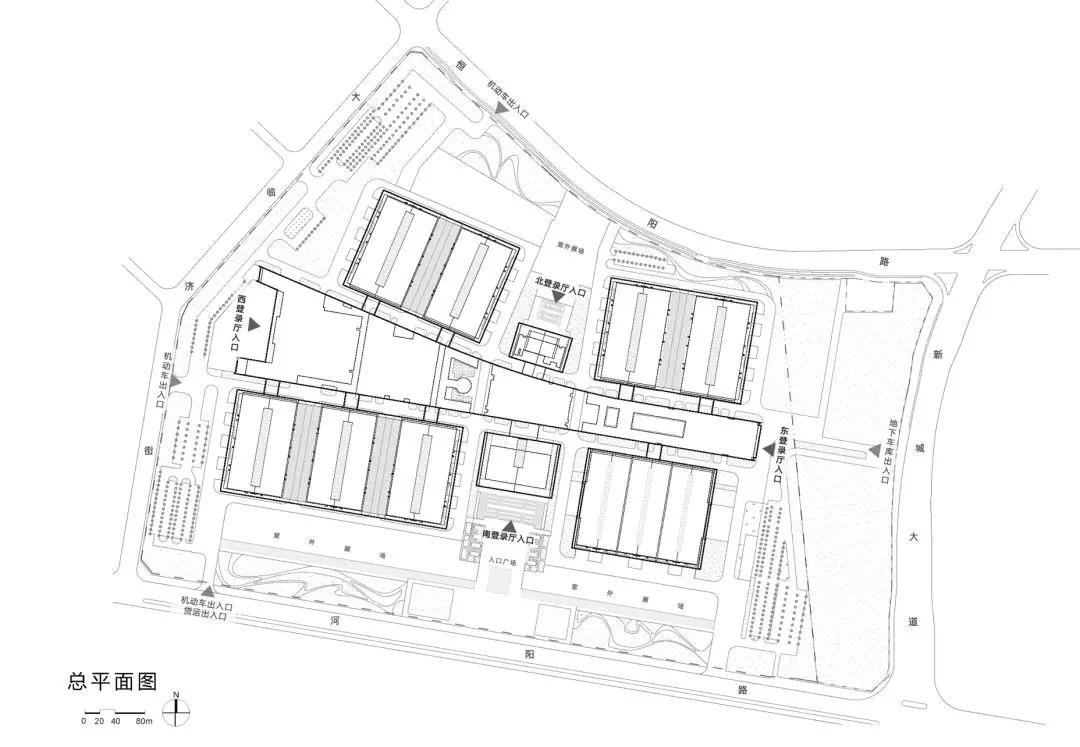 1、圍繞會展建筑的開放城市空間。場地不設圍墻市民可以自由出入,靠近城市干道界面多設置近人尺度景觀小品,鼓勵與外部互動與交往。同時將原規劃貫穿東側綠地的地面車道改為地下車道,將北側園博園到南側滹沱河公共綠地休閑步行通道連為一體,為市民創造豐富、連續、宜人的公共開放空間。