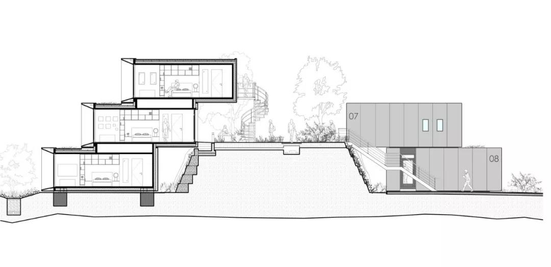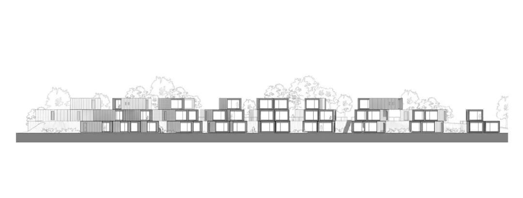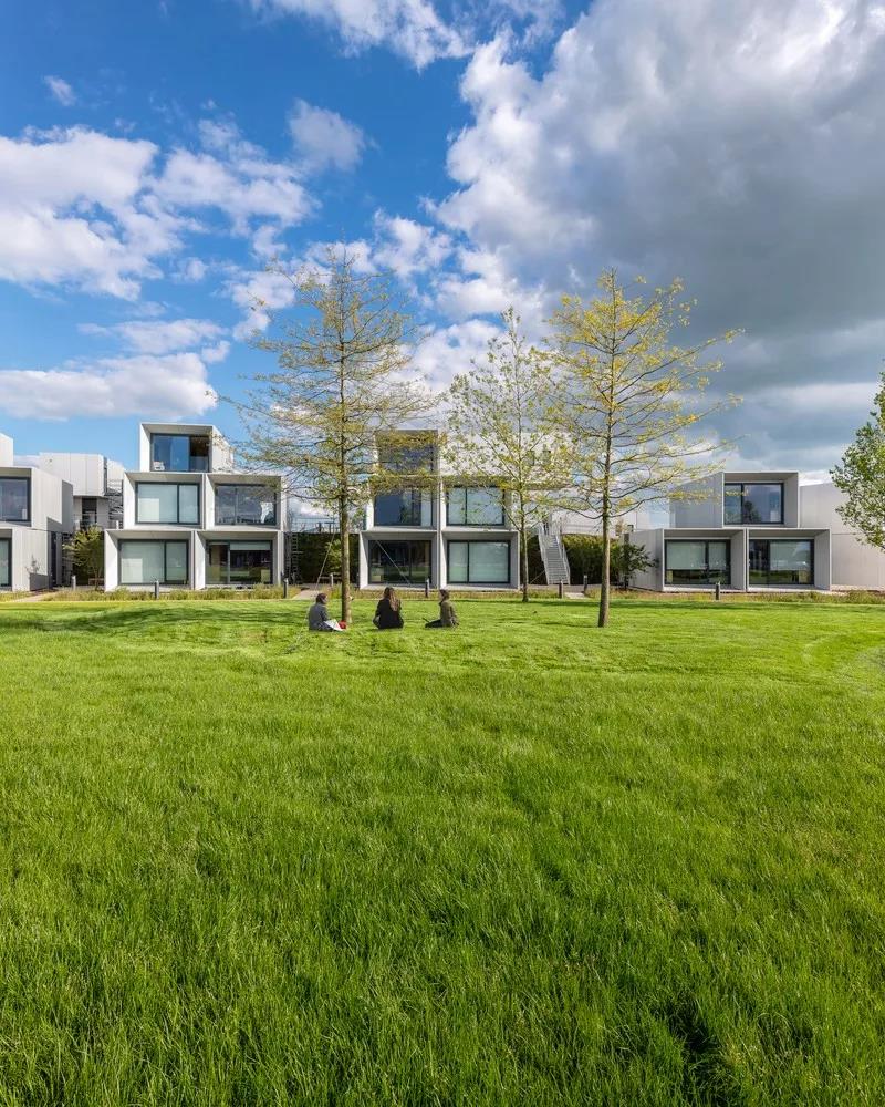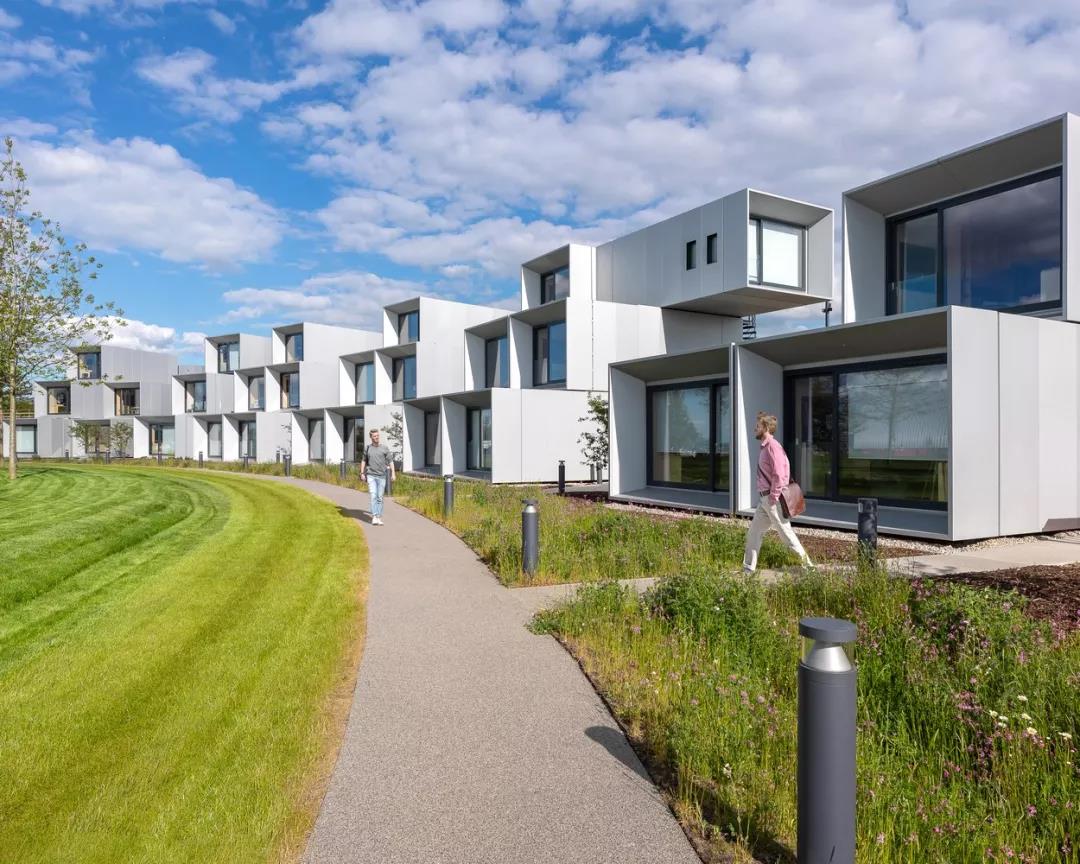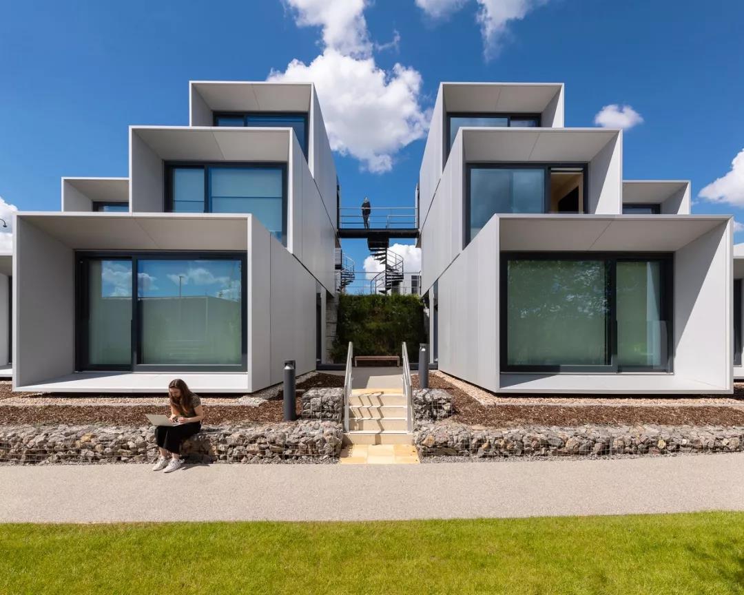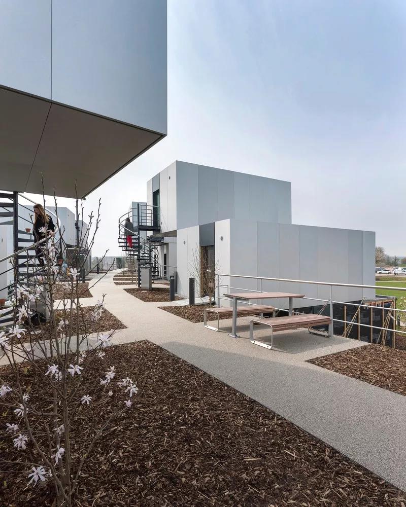 在新月形場地內,這些艙體沿著周圍景觀路堤的曲線,以各種群組形式排列。每個群組最多由六個單元組成,包括一個位于中間入口層的共享廚房和洗衣房,以及一個帶有接待和存儲的入口區域。為了營造學生社區的感覺,每個艙體都擁有獨立前門,較低的艙體通向景觀花園,較高的艙體則通向蜿蜒的地面坡道和通往樓上的樓梯。