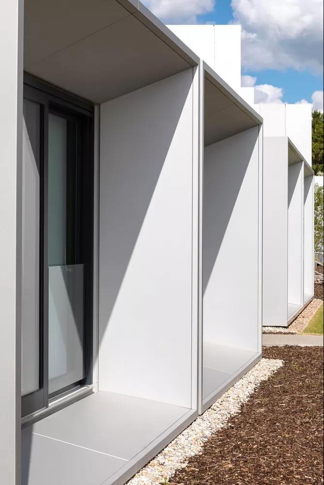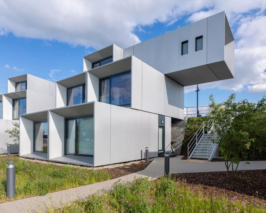 幸福感是設計的一個主要考慮因素,每個艙體都能實現自然通風,且擁有大面積三層玻璃窗,每個窗戶的角度都是精心設計,以保證居住著擁有開闊的視野。艙體外部覆蓋有鋁制雨幕板,根據其在每個單元內的位置,設置了植物覆蓋的屋頂。