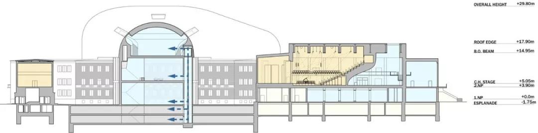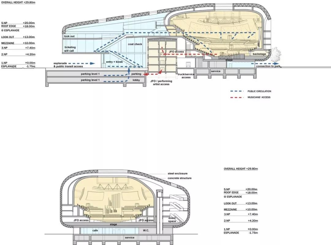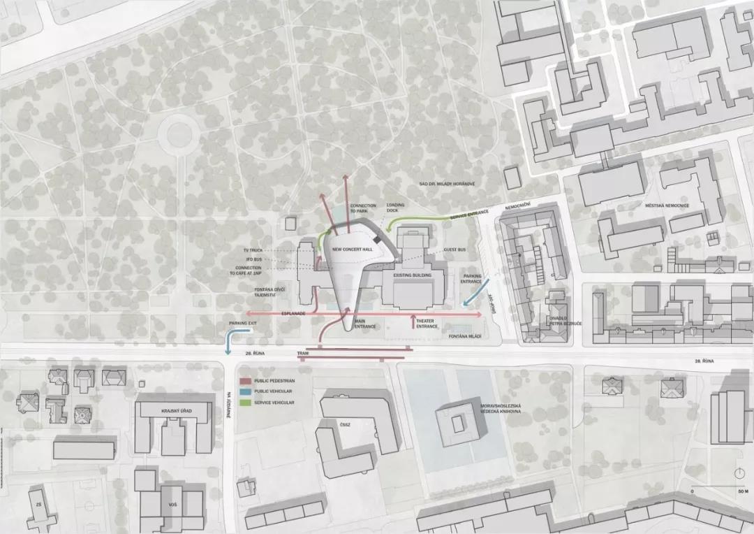 這座新建筑是與Nagata聲學公司合作設計的,將為該國領先的當代管弦樂團Janacek愛樂樂團提供演出空間。該設計通過將主廳靠近建筑后部的現有公園來屏蔽城市交通噪音,而長廊上的新入口可以上升至現有中心的頂部。新舊之間戲劇性的對比為這座城市創造了一個文化地標。