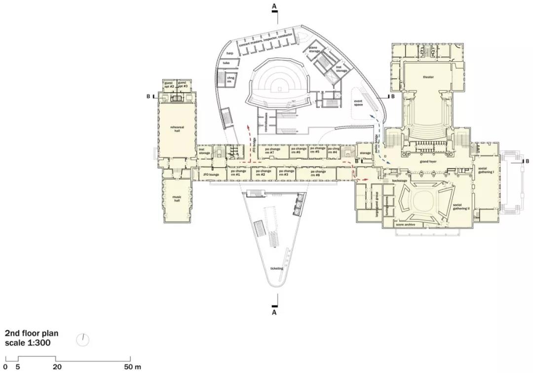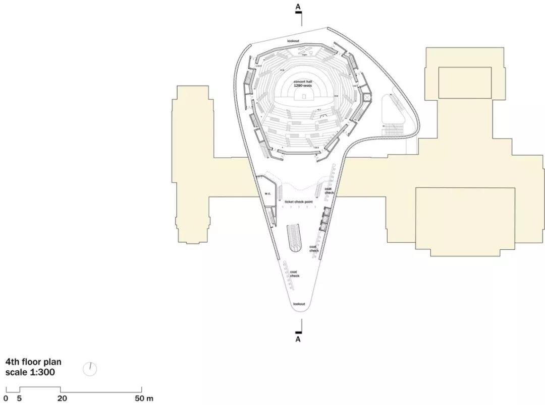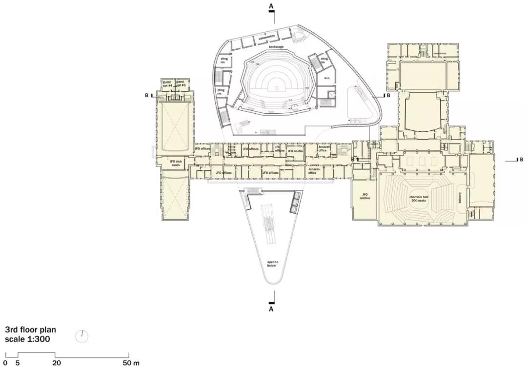 建筑就像一個光滑的鋅盒子里裝著由混凝土和楓木制成的“儀器”,其平面為擴展的葡萄園式平面。該設計受到捷克作曲家Leos Janackek的影響,他的時間理論指導并賦予了內部幾何學的秩序。隔音墻板有三種類型:“Znici”、“Scitaci”和“Scelovac”。