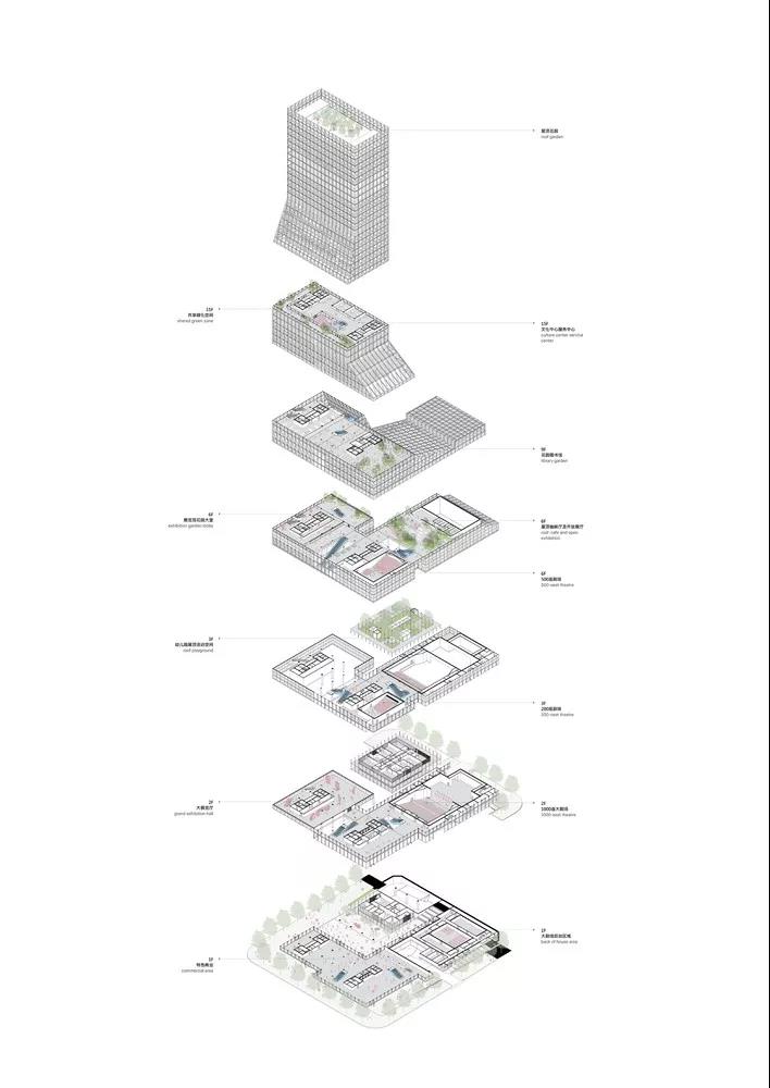 因為福田區極高的密度,大量的文化功能需要擠在一個極小的場地上建造。項目地上建筑面積為 62000 平方米,包括三個劇院,一個圖書館和一個展示大廳。設計任務書中還包括了在附屬地塊上設計一個幼兒園的要求。所有的功能都在這個 L 型場地中完成,而塔樓的高度不能超過 150 米。