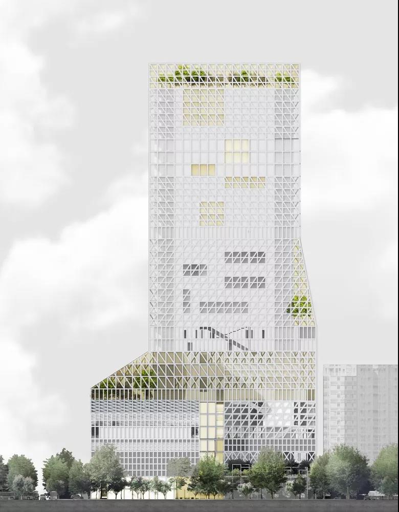 為了賦予這座文化中心一個強有力的、統一的外形形態,整棟樓被三角形的網格立面包裹,并在劇院的位置張開以容納它的體量。建筑往下縮緊,從 150 米的塔樓平滑地過渡到旁邊體量較小的幼兒園上,將它們連在一起。