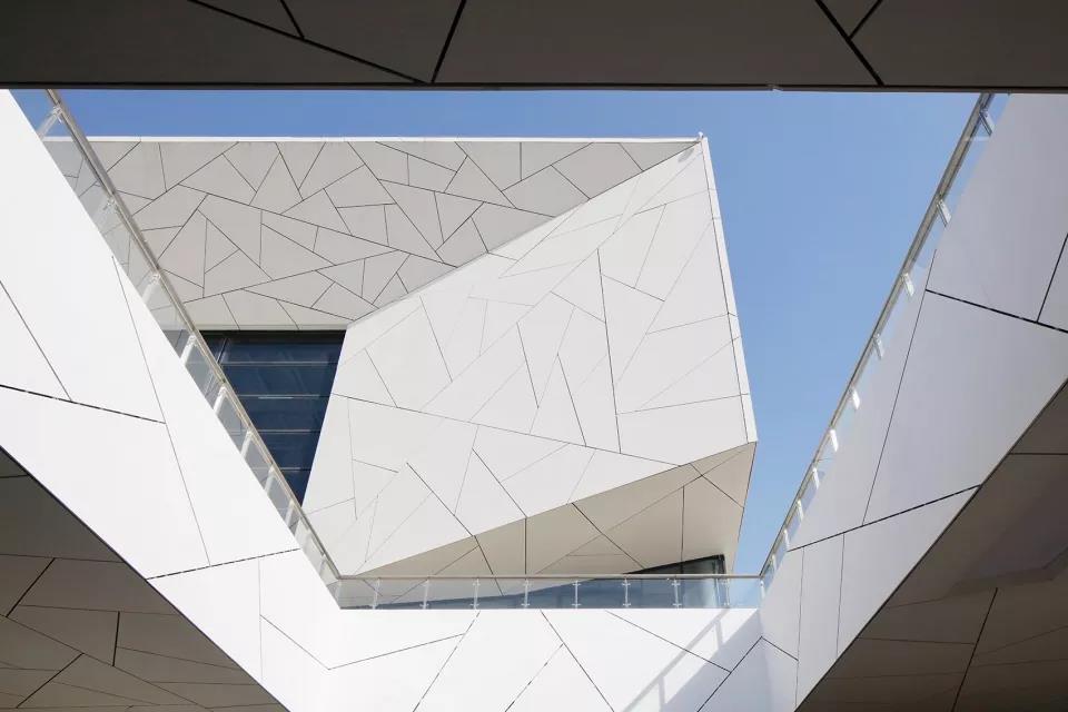 劇院由兩個向上傾斜互相交叉的體量構成,屋頂一直延伸至地面邀請游人上前參觀。兩個結構都擁有立體的幾何立面,它們的靈感源自冰面裂開時呈現出的紋路,圖案從實材為主的后側一直延伸至完全透明的前廳。