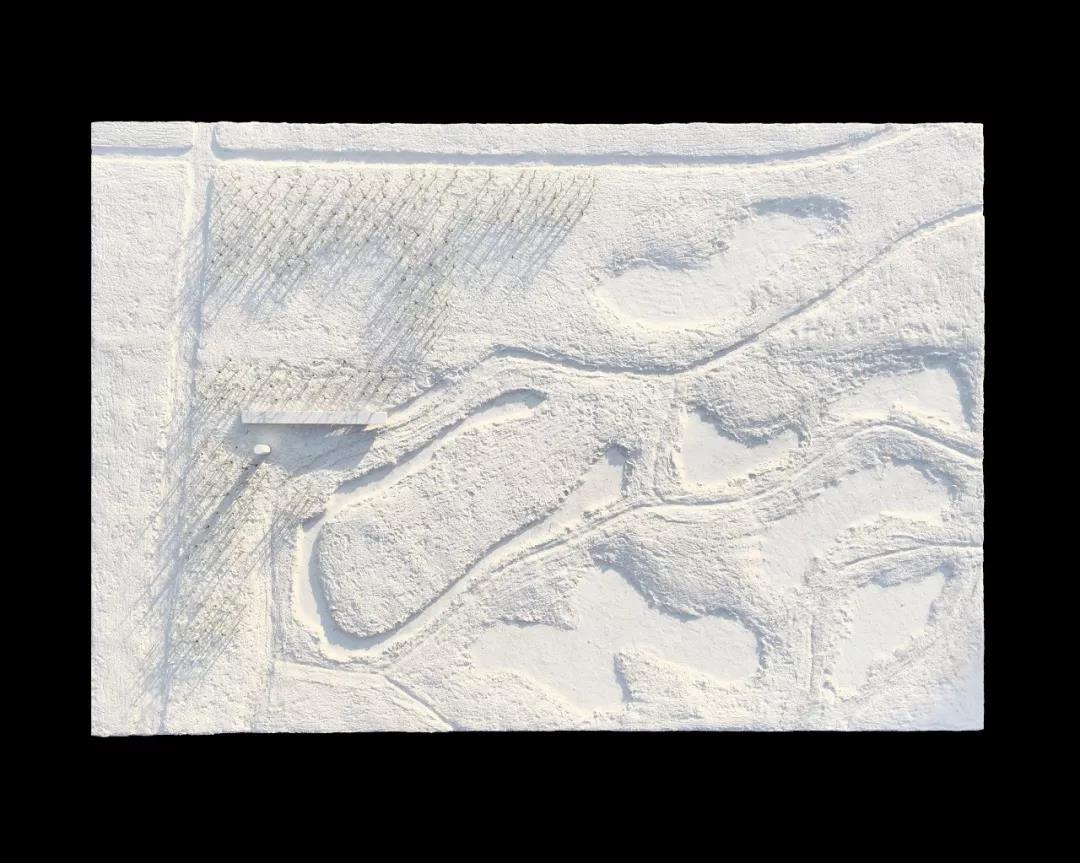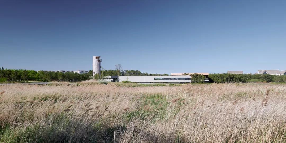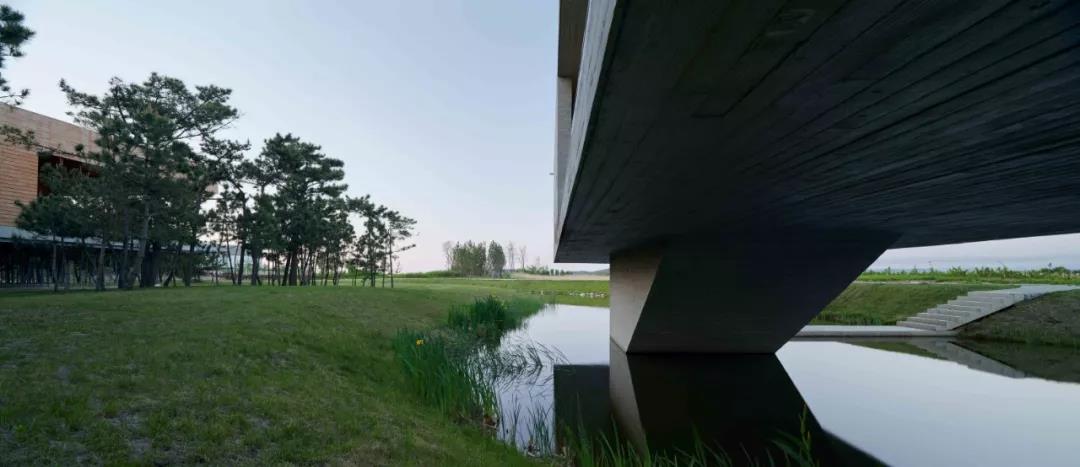 建筑選址于濕地東北角,此處背靠一片茂盛的黑松林,面朝整個濕地景觀。建筑在場地中的形象可以被理解為一座“橋”和一座“塔”:水平向的景觀廊長71米,如同濕地上的一道長橋,架空漂浮在柔軟的土壤和水流上,最大化地保持了自然地形的延續性,又如一把從濕地伸入水面的標尺,通過自身的水平性提示下方地形的變化;豎直的瞭望塔高15.6米,如同水邊的燈塔,為游客觀景提供了一處可以俯瞰濕地、遠眺馬山的高點視野。一橫一豎兩個體量,在空間的三個維度上與場地緊密地聯系起來。