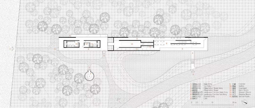 設計起始時,景觀廊的功能僅被規劃為咖啡廳與衛生間。建筑周圍的環境要素與使用者的行為要求希望其呈現出對濕地及松林景觀充分開放的姿態,由此建筑被自然而然地賦予了觀景游覽這一串聯前兩者的第三個屬性。