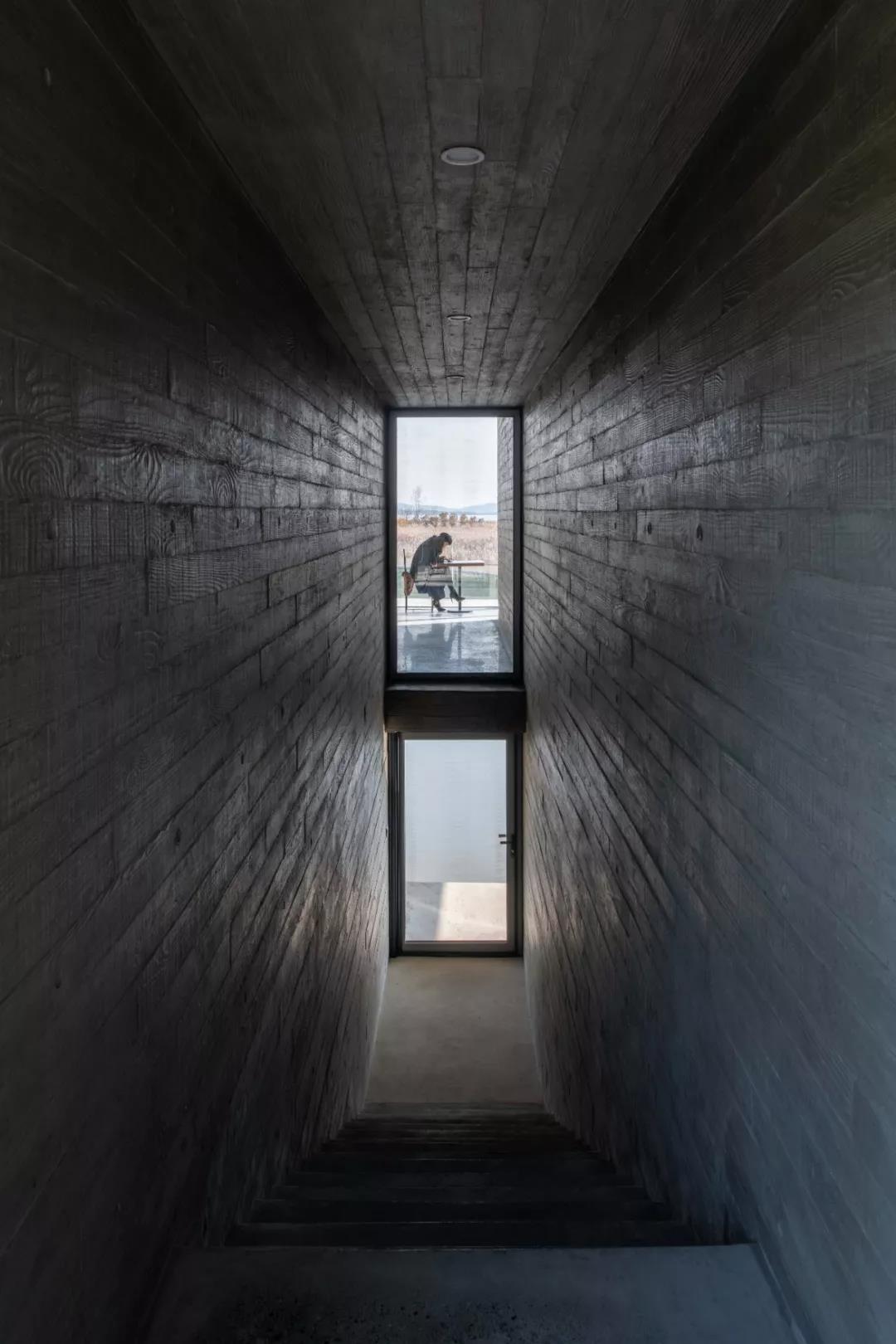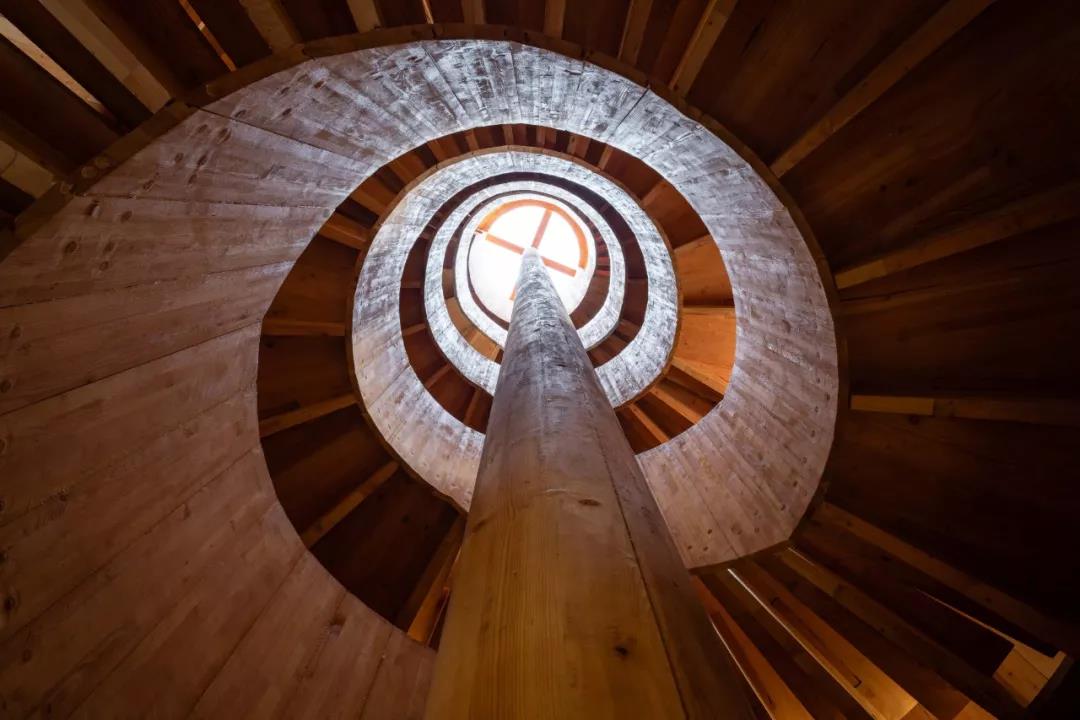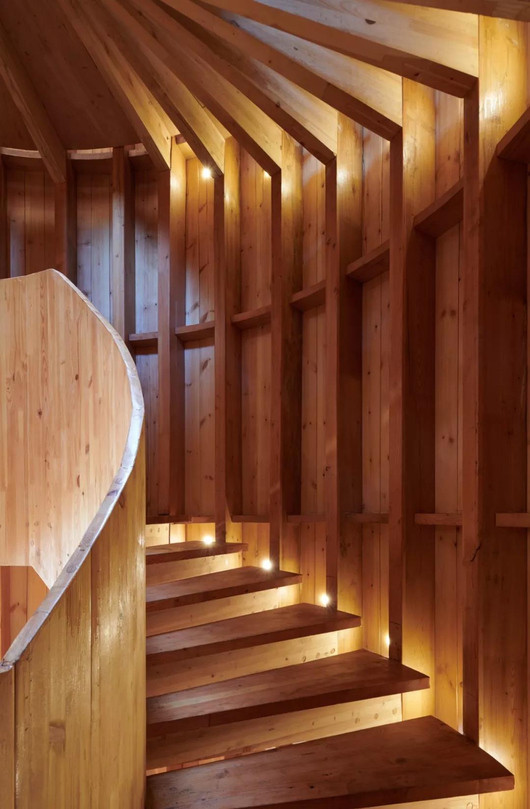 木塔內部的主要光源來自屋頂中心的天光,因此建筑空間整體呈現出從低到高逐漸由暗變亮的狀態。進入塔內后,空間起初較為幽暗,游覽者可沿木質樓梯盤旋而上,途中會經過幾個小窗洞,透過窗洞可隱約窺探到一幅幅片段化的“框景”。隨著高度的上升,室內逐漸變亮,直至到達旋轉樓梯盡頭的塔頂瞭望平臺后,視線才終于打開,由此可俯瞰到整個天鵝湖的濕地景色。