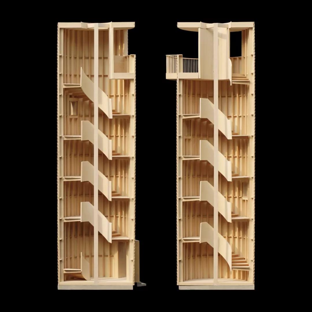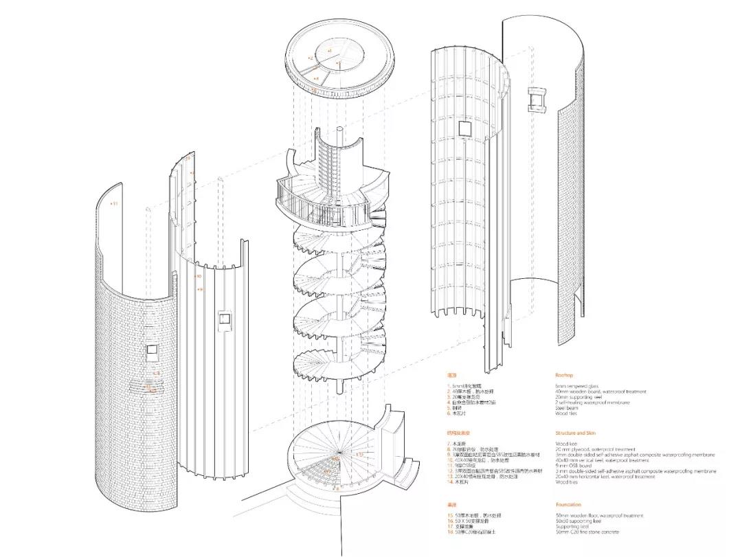 觀鳥塔因其純粹的功能要求,設計的重點便是如何營造游覽過程中的體驗和氛圍。從外部看,塔的整體較為封閉,材料為木瓦片,這種材料經歷日照和氣候影響,瓦片顏色會由原木色逐漸變為灰色,呈現出更為靜謐的氣質。