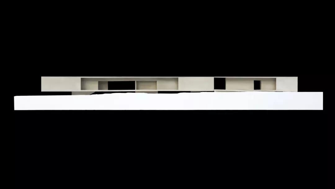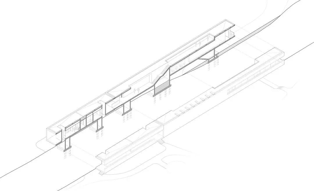為了實現橋式的大跨度結構,建筑采用全現澆木模混凝土這一種結構即建筑的建構方式,在兩塊水平樓板中布置了若干起結構作用的現澆墻體,在增強結構整體性的同時分隔出不同性格的建筑空間。