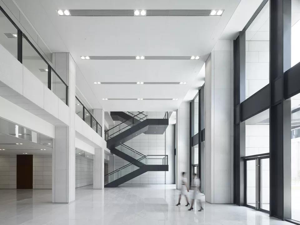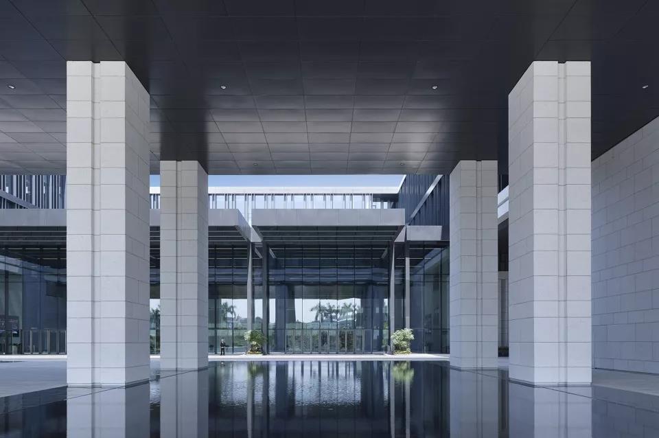 建筑群由一個堅實的基座、通透的連接部分和一座仿佛懸浮其上的體塊組成。淺色橫向花崗巖立柱刻畫了建筑立面的整體形象,形成了建筑群造型語言的主題,因其具有一定的進深還起到了為室內空間遮陽的作用。煤黑色豎向框架與淺色花崗巖產生對比,幕墻框架內還集成安裝了遮陽窗簾,構成了一個散熱建筑外表皮。建筑室內空間的設計也選擇了相似的材料元素,園區、單體建筑不同功能區域均保持了一致的設計風格。