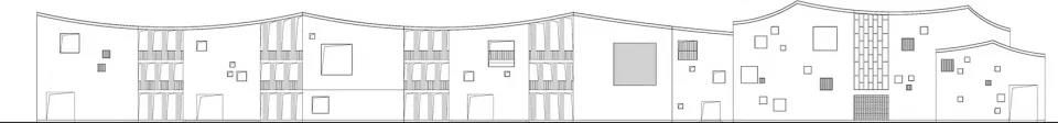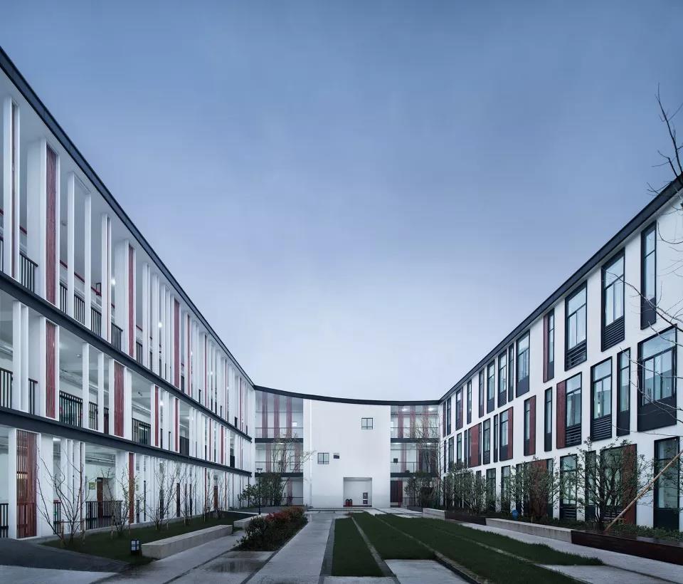 學校主體建筑群主要由教學區、體藝辦公區和后勤區組成,環形風雨連廊連接各個功能區,使得建筑成為一個有機的整體。學校以“園”為基本構成單元組織校園空間:教學綜合區以一條南北向中軸串聯整個區域,回型風雨廊將各個院子串聯成為一個整體;對中國傳統建筑園林空間中“半房半院”的組織手法加以傳承和演繹,在場地正交網格體系中選取U型建筑體量作為基本的模塊單元,加以重復、組合滿足多重功能需求,U型建筑單體圍合成多個院落空間,并相互滲透、疊院成園,營造出園院相嵌、圍而不隔的園林化校園環境。