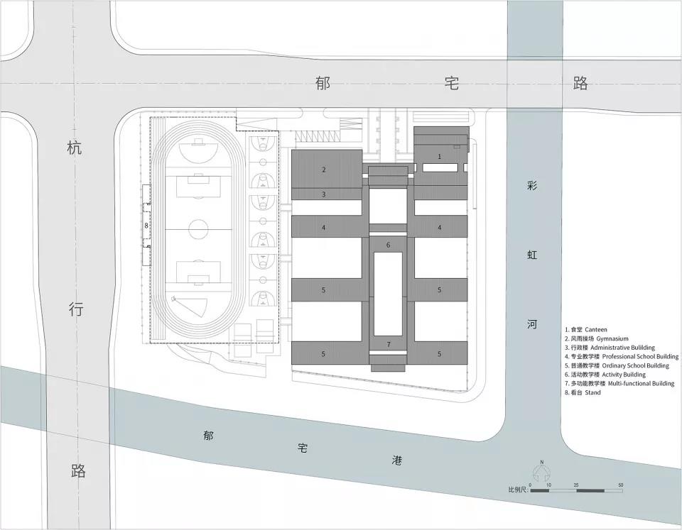 杭州是世界物質文化遺產京杭大運河的起始城市,建筑師意圖將校園景觀融入到運河生態景觀長廊的大環境中,為孩子們提供一處自然、具有活力的成長空間的同時,能夠完善其對這座城市的山水、歷史與人文的認知。