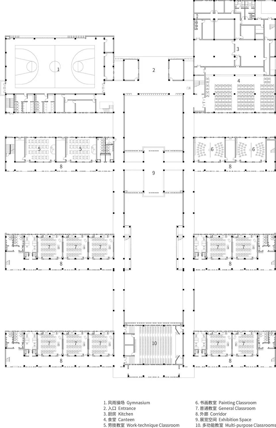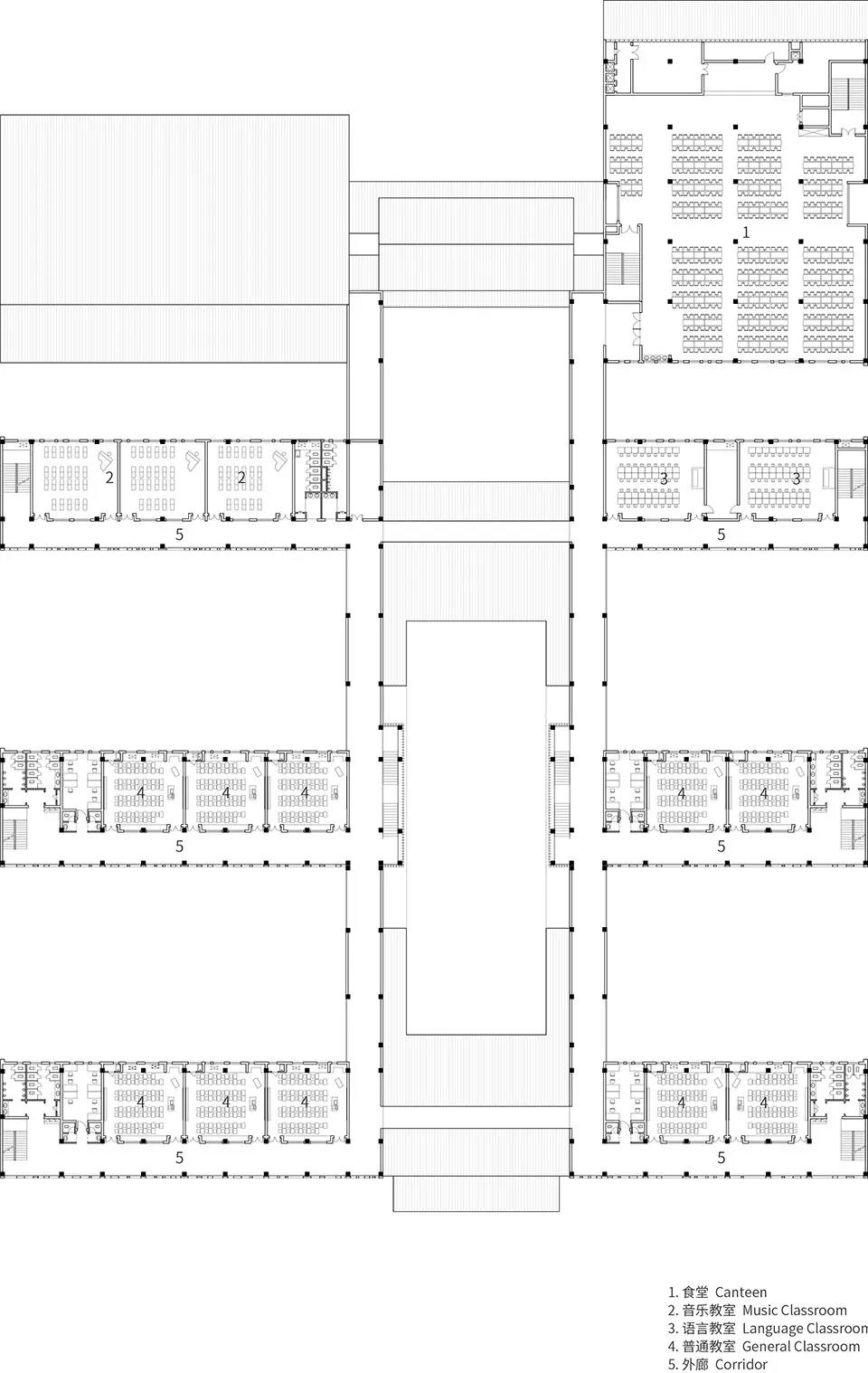 各個組團院落在空間上被連廊這一灰空間分割,但視域的滲透和氣流的流動卻沒有被阻斷,使得院落的空間層次感加深。各功能單元在一層圍而不合的空間結構,提供了院落間路徑和視線滲透的可能,使行人獲得步移景移的使用體驗,同時增加了學生活動更加豐富而多樣化的可能性。