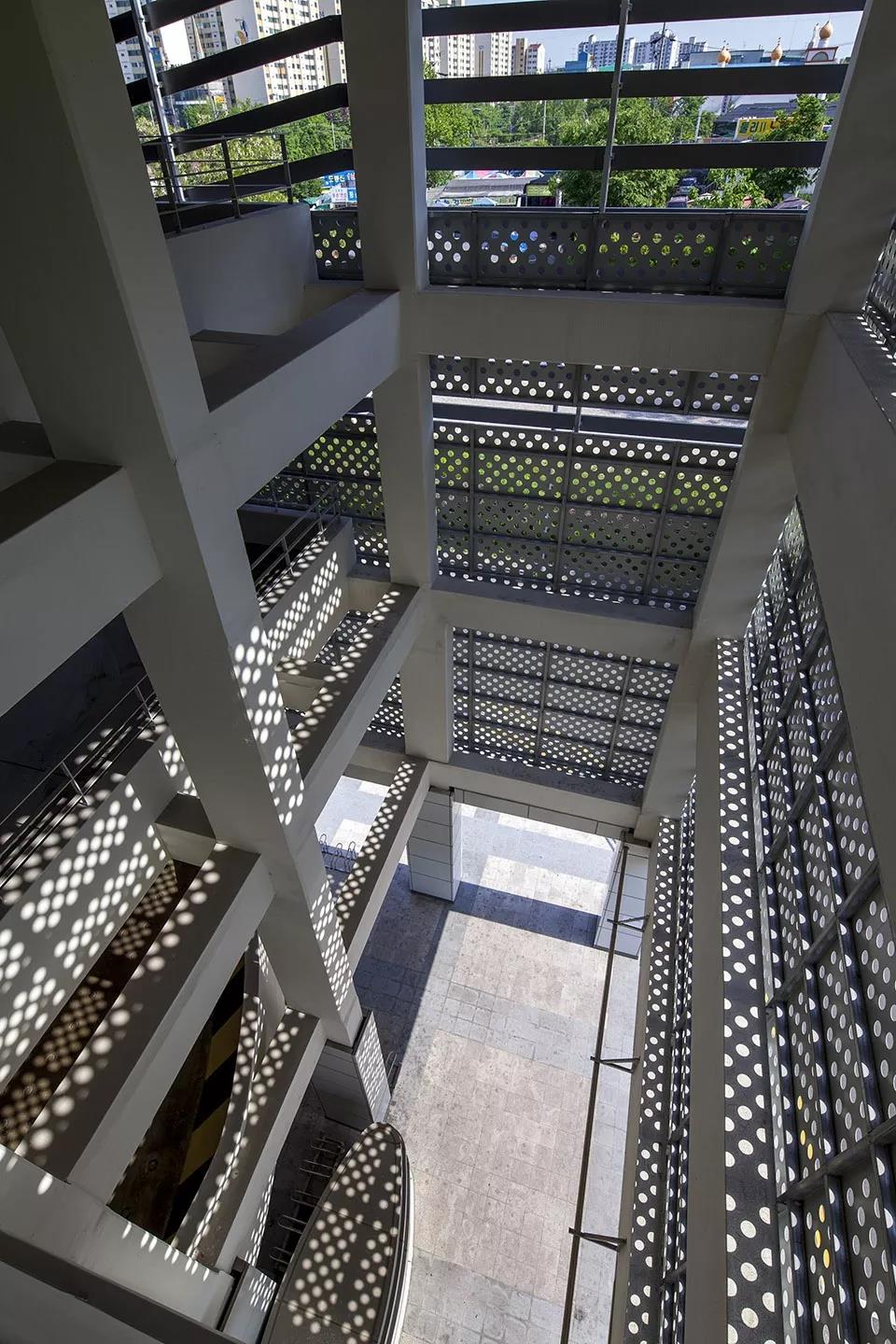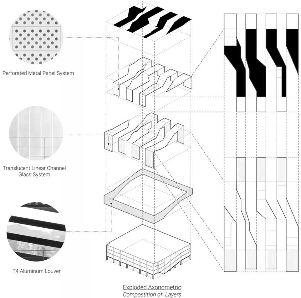 這七個金屬帶彼此配合,共同組成了停車樓的外表皮,并在視覺上創造出一種與城市環境相關聯的建筑語匯,更避免了停車樓的巨大體量在城市環境中造成的支配感。值得一提的是,根據材料在自然通風和透光等方面的性能,設計團隊最終選擇了半透明的玻璃板、穿孔金屬板和金屬百葉這三種可滲透材料來打造上文所提到的金屬帶。