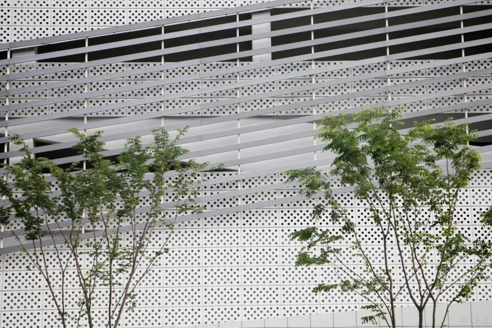 ▼停車樓外表皮局部,彼此分離的金屬穿孔板和金屬百葉構建出建筑一側的外表皮