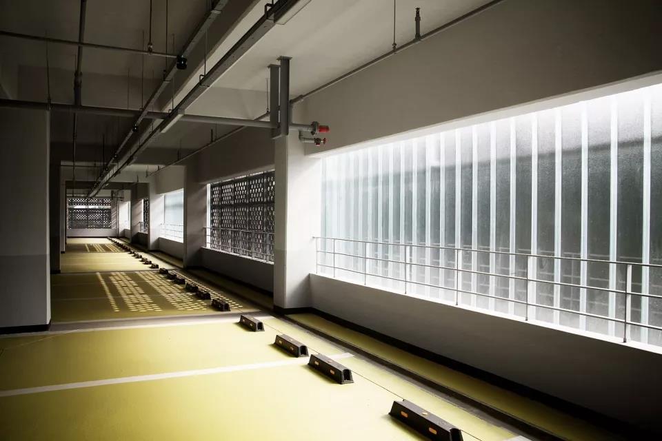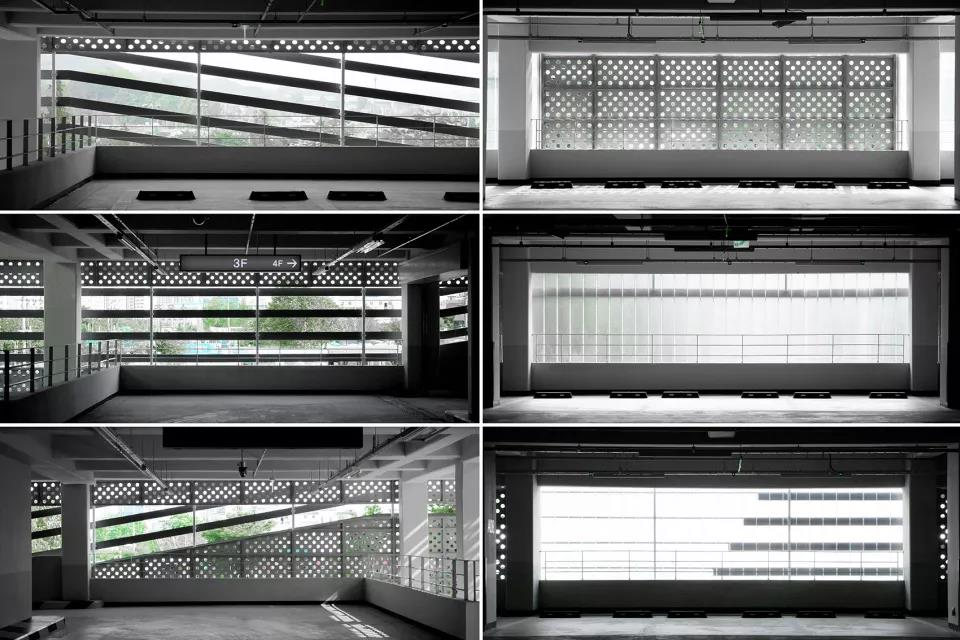 ▼停車樓內部,半透明玻璃板與穿孔板交替出現
