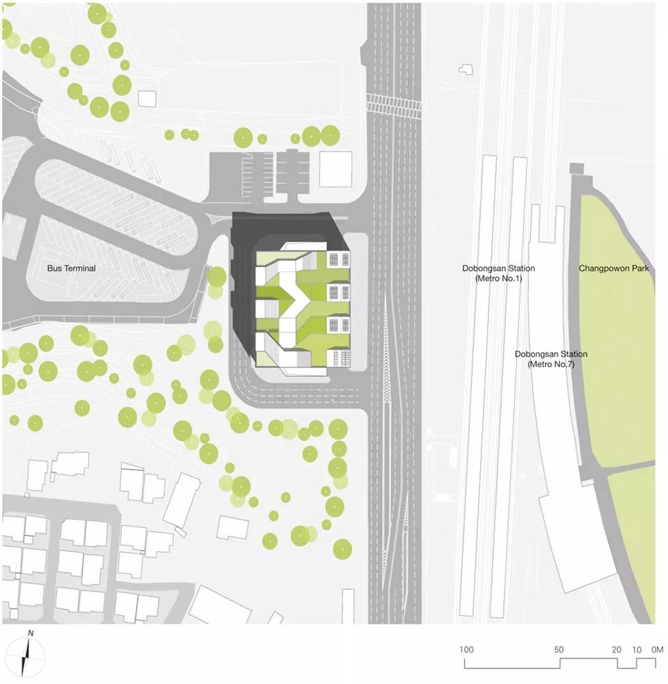 通過設計建筑的屋頂空間,“將停車樓作為一個公共空間”這一本項目的主要設計概念得以實現。在屋頂空間中,外表皮的金屬帶變成了一個人造的景觀,創造出一個公共花園和廣場。由傾斜屋頂打造而成的人造地形則在建筑與道峰山景觀之間構建出一種視覺聯系和體驗式對話。