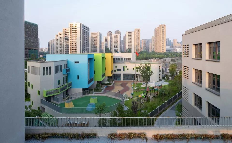 在錢江新城高密度的住宅高層包圍之下,杭州勝利小學附屬幼兒園的用地十分局促,不足3900平方米,但仍需滿足9個班級的規(guī)模與豐富多元的功能要求。嚴苛的場地限制下,建筑師通過一系列設計策略,在滿足功能訴求的同時,堅守為兒童創(chuàng)造充滿陽光與活力的空間這一初心。