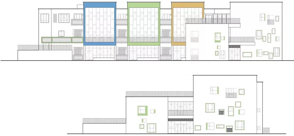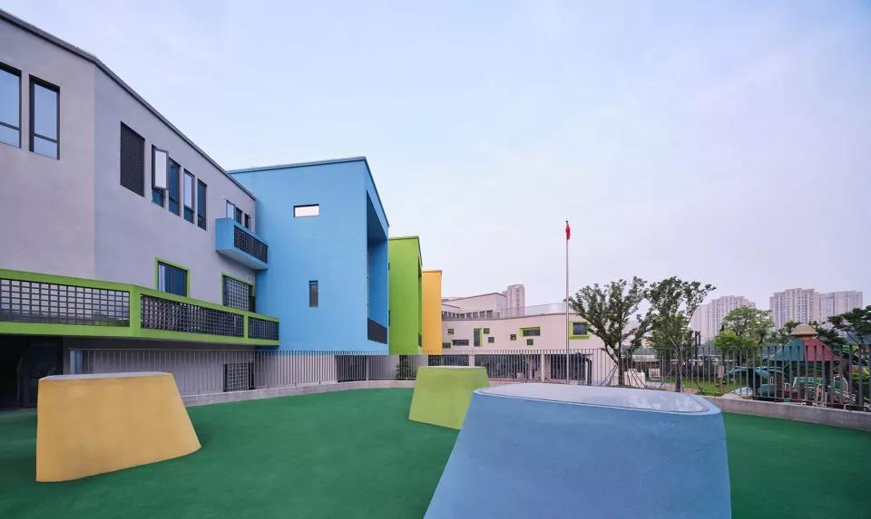 建筑師克制地運用著色彩,以原勝利小學標志中的藤******、天藍色與草綠色作為設計的三原色,以點綴對比的手法激發(fā)輕松有趣的活潑氛圍。在整體淺灰色外立面中,教學單元體塊通過明快的三原色凸顯其作為漂浮積木塊的印象,也提高孩子對自己教室的識別性。