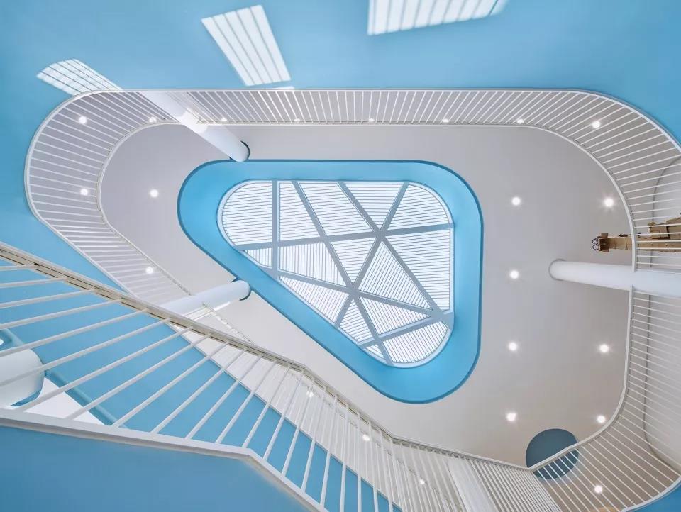 ▼主入口門廳中庭,藍色飄帶設計貫穿整個中庭,光線從圓角三角形天窗中灑下