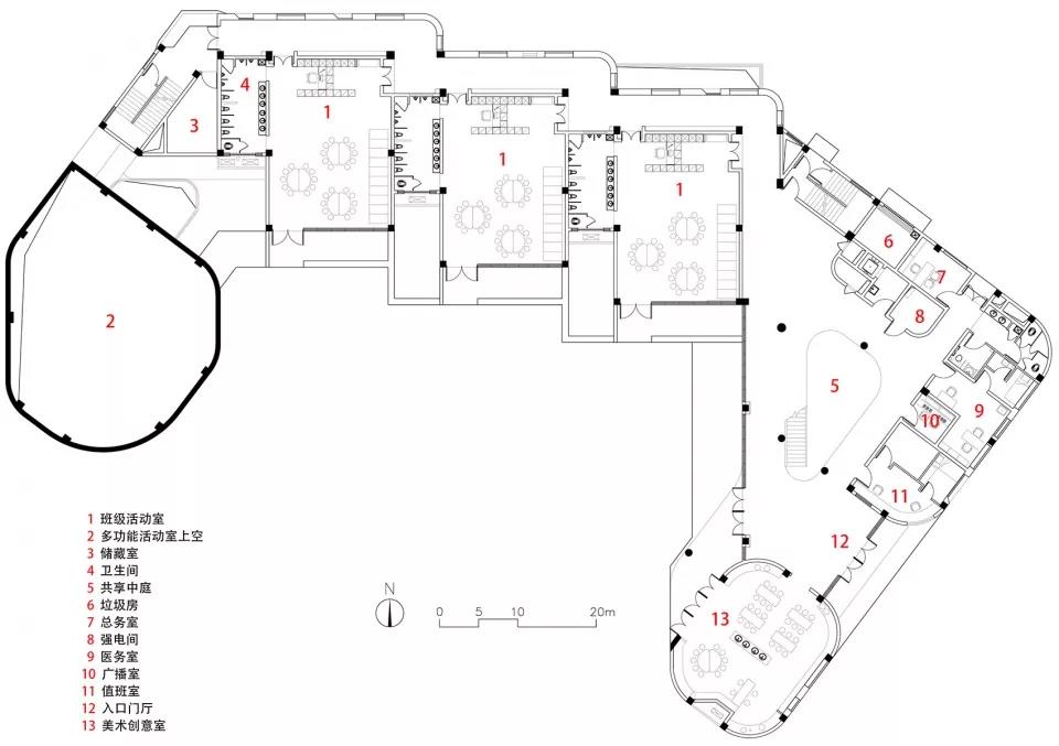 建筑師還積極聽取了業(yè)主的優(yōu)化建議,為使用方的師生們自我發(fā)揮與自主布置創(chuàng)造了一系列留白空間。尊重設計的使用方充分理解建筑師的設計理念,通過與空間的互動、適應與調整,對設計進行二次升華,在教學單元、活動室、甚至中庭、走廊與戶外場所中,靈活地融入豐富的教學、游戲與交流活動,讓孩子們在不同空間中盡情享受著體驗探索的樂趣。
