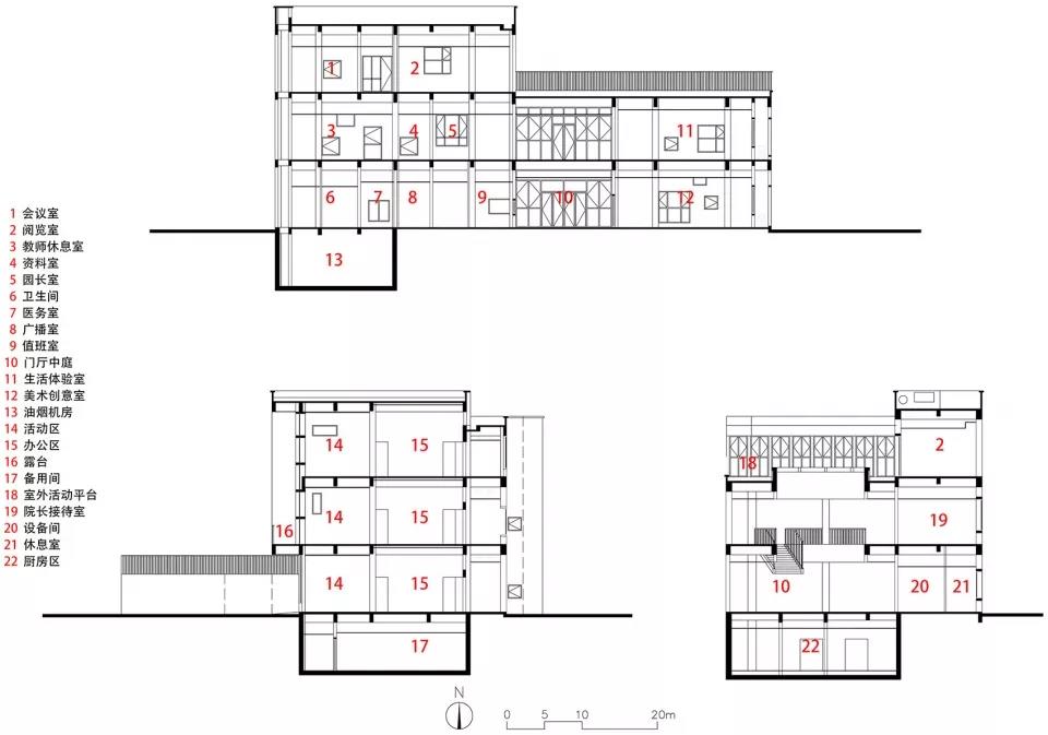 為解決功能面積與容積率的矛盾,向地下與屋頂露臺借空間,將多功能活動室及廚房等輔助用房安排在地下室,并以天窗、高側窗、下沉庭院等滿足其通風與采光的需求,充分利用一層與二層的屋頂露臺為孩子們增加安全的戶外活動場地。