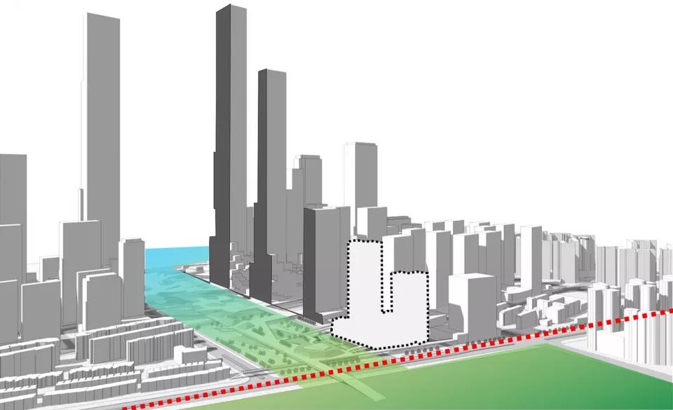 ▼總平面圖,中國天音通信大樓的地塊位于中央公園和濕地公園交界處的東北角