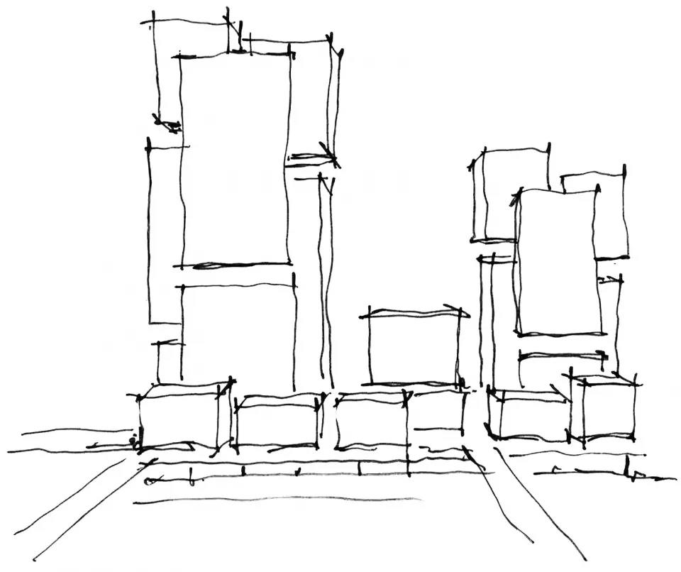 ▼概念手繪草圖,兩棟塔樓由不同的長方體塊堆疊構成