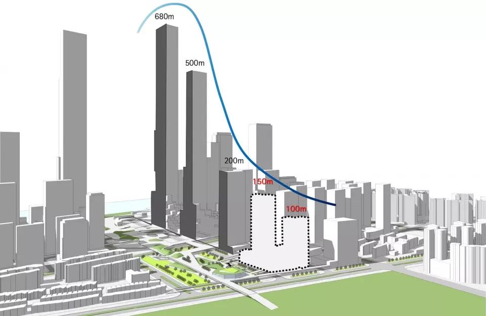 城市總體設計規劃了最高可達600米的摩天大樓群,沿著中央綠軸向北,塔樓依次降低高度。gmp為專門提供智能手機和其他移動設備軟硬件服務的中國天音通信公司,設計了南北兩座高度分別為150米和100米的塔樓。位于同一個基座的兩棟塔樓,由不同的長方體塊堆疊構成,在塔樓的不同高度,設有“空中花園”和“空中客廳”。