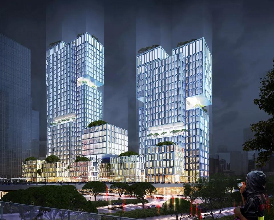 ▼東北視角夜景效果圖,在塔樓的不同高度設有“空中花園”和“空中客廳”