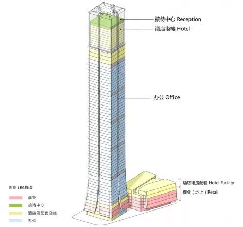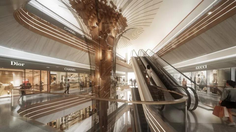 商業裙樓立面以抽象化的印章為元素與塔樓形成呼應,由四瓣式作為基本的單元形式,結合室內空間對自然光的需求,經過一系列漸變式的組合,成為具有韻律感的生動立面。內部南北兩個中庭以倒置印章為元素,營造出簡約內斂的東方質感和藝術氛圍。裙樓主入口朝向繁華的商業步行街和商業廣場,地下流線貫穿下沉廣場和萊迪廣場,連接地鐵2號線,動線流暢,有力引導人流,提升商業效益。