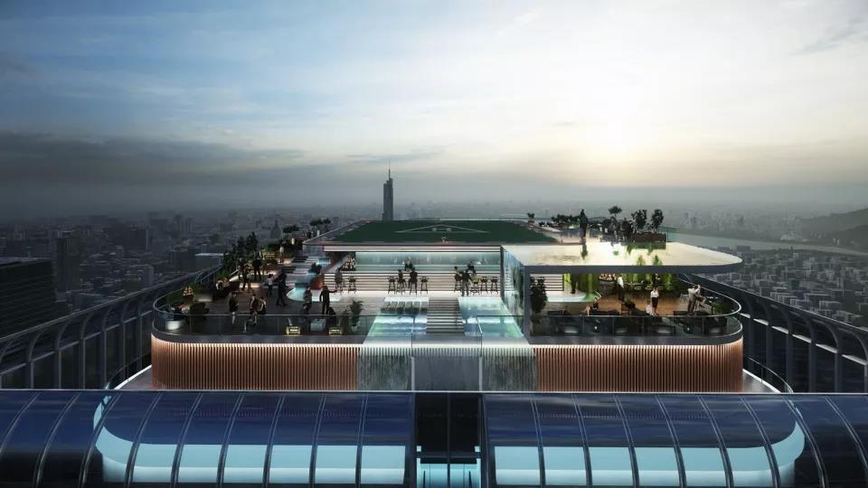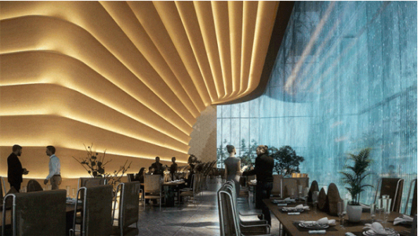 塔樓基座采用舒展的弧線,首層大堂內部沿用四瓣這一基本形,從主體到細節設計一氣呵成,夕陽余暉下,佛如一枚玉石印章,端方大氣。中下層的辦公及酒店服務設施區域,自然光照充足通透,寬敞明亮。視野極佳的高層是酒店,可以眺望玄武湖、紫金山美景,一覽城市景觀。頂樓創意的水下餐廳和拾級而上的屋頂酒吧,讓人們在錯落有致的平臺遠眺城市美景,感受這座偉大城市的千年變遷。