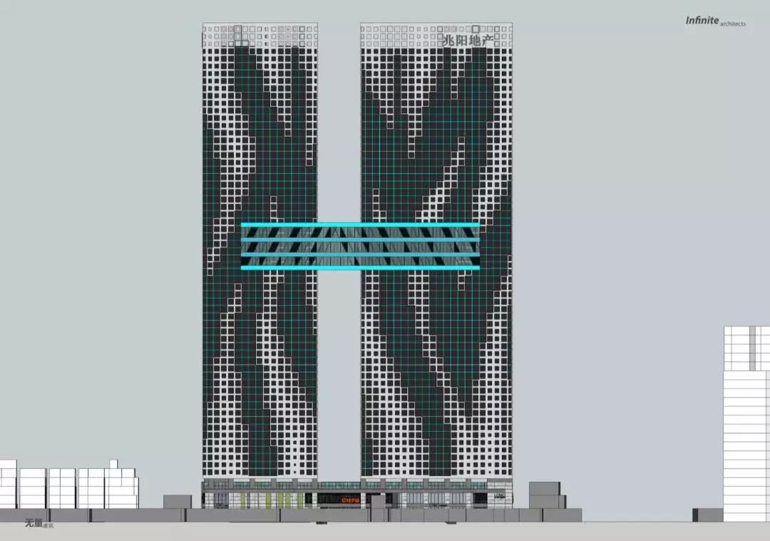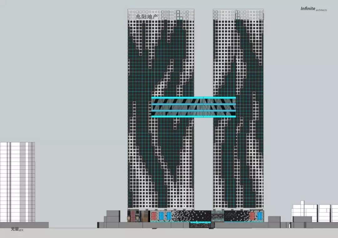 本項目位于禪城區朝安路與同濟東路交匯處。區域超高層建筑稀缺,周邊建筑多為高層住宅與低層廠房,周圍兩公里范圍內有亞洲藝術公寓、嶺南明珠體育館等標志性公共建筑。考慮到周邊無高層建筑,為了避免過高的天際線在居民區顯的突兀,我們決定降低建筑高度通過兩座的160米的“雙塔”強調其標志性。