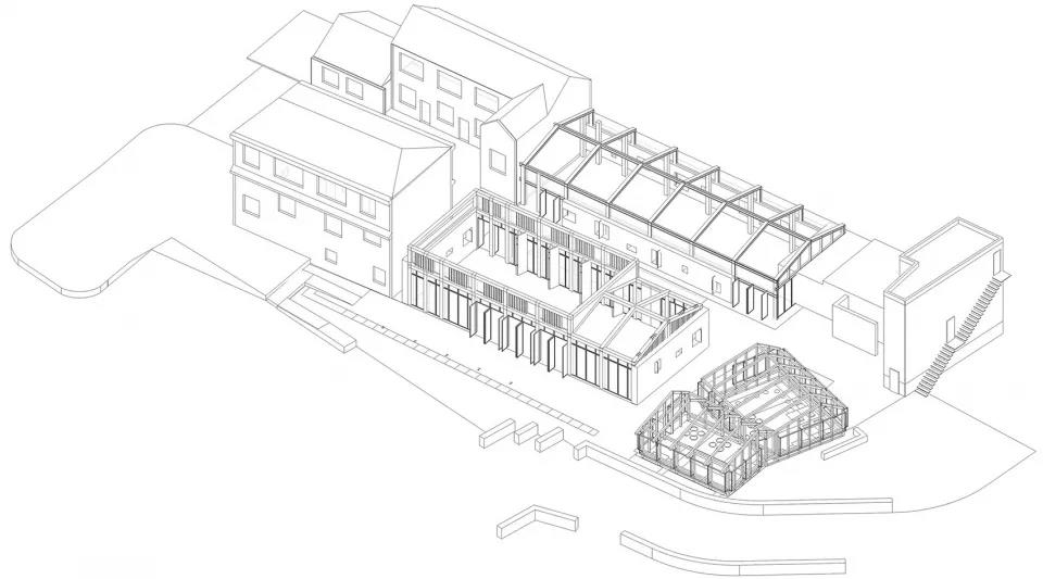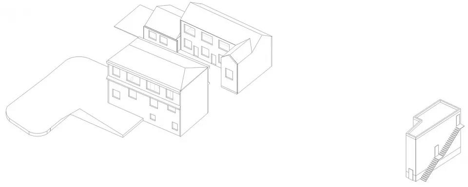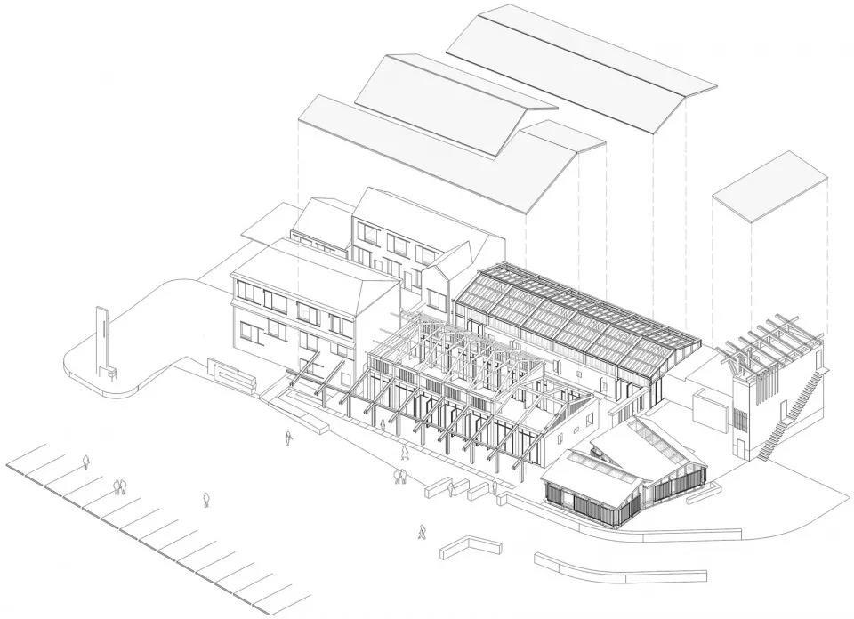 ▼游客接待服務(wù)中心軸測圖,新建部分與原有建筑相結(jié)合