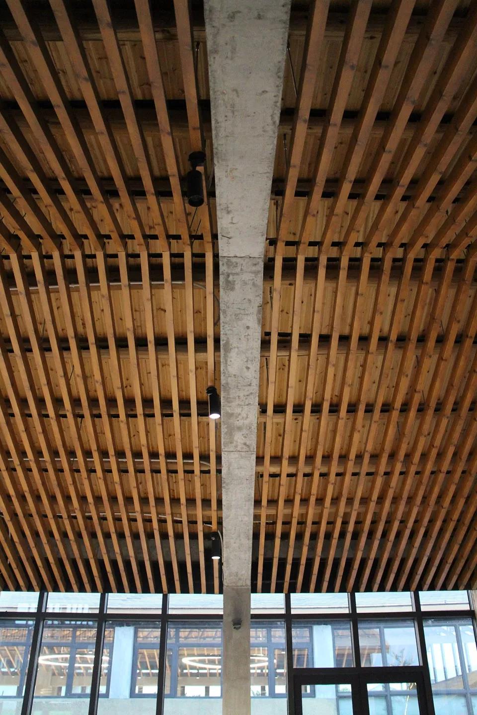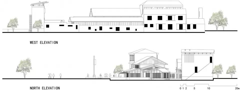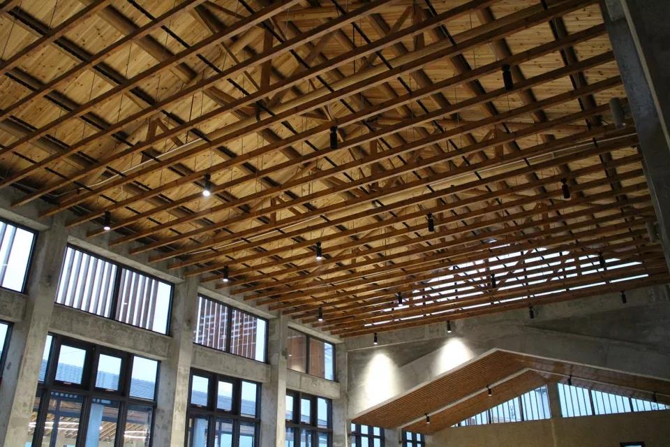 整個(gè)項(xiàng)目盡可能的使用木這一主材,通過與鋼材、玻璃等現(xiàn)代材料的結(jié)合,拓展建筑的表情與特征。入口空間,鋼與木兩種材料通過組合延伸了原先空間的邊界,東側(cè)的敞廊空間構(gòu)成了整個(gè)建筑朝向入口廣場的正面性。錯(cuò)落的屋架與豎向可轉(zhuǎn)動(dòng)的木百葉等處理既是形式變化的需要也是對基地條件的一種主動(dòng)適應(yīng)。