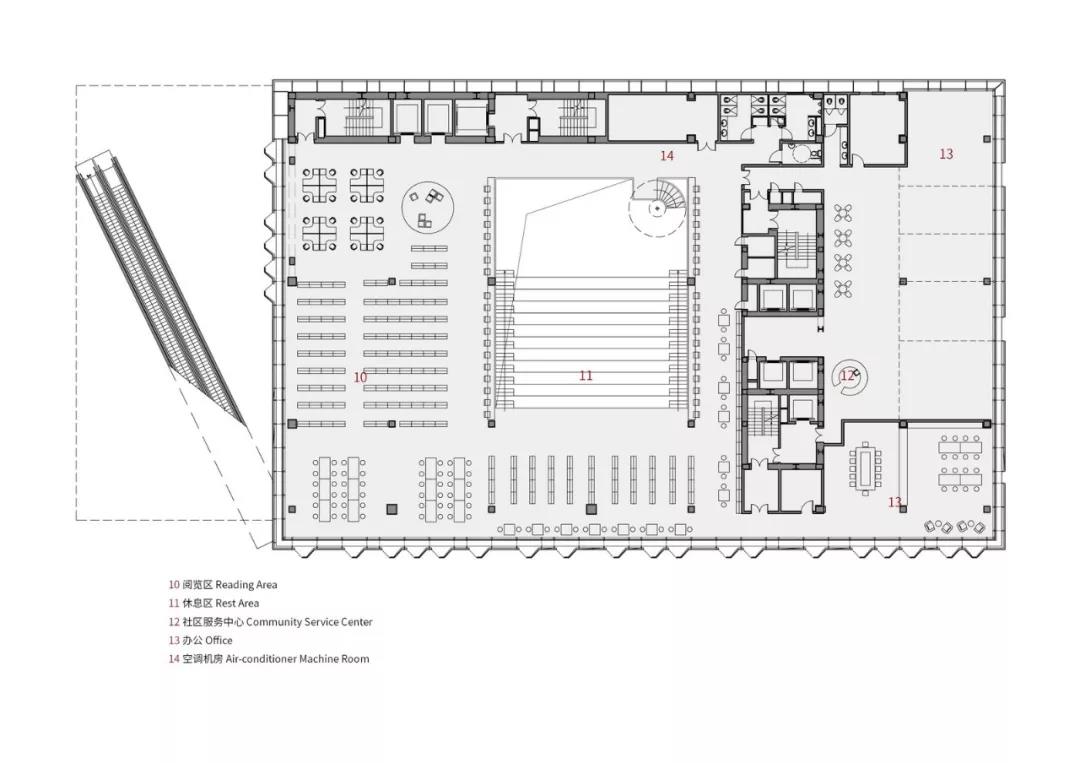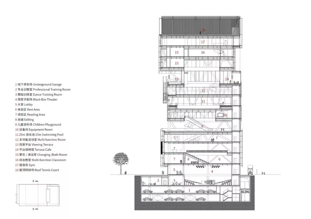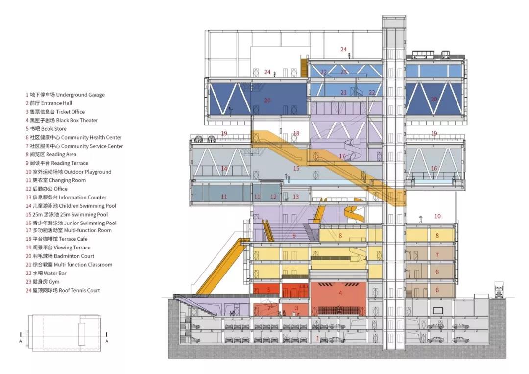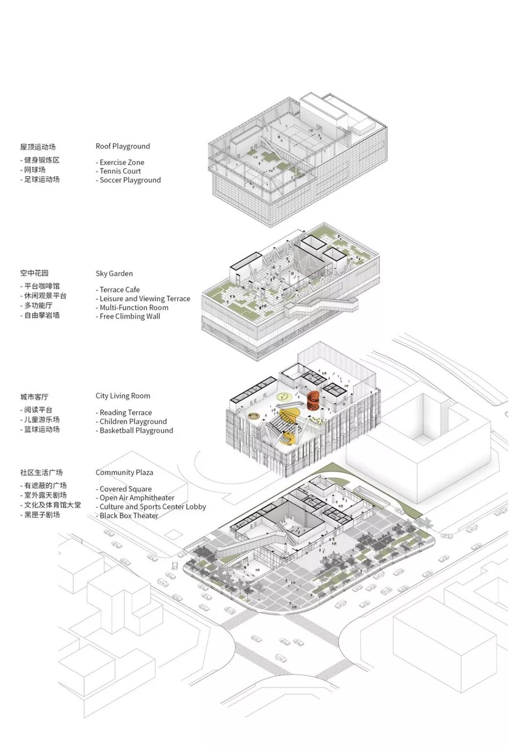 傳統的文體中心中,各類功能空間往往相對獨立封閉以避免使用上相互干擾,這就使得整座建筑成為純功能性場所而非積極的社會交往空間;而圍繞在建筑周邊看似零散的城市開放空間因提供了不同人群之間互動的多種可能性,反而成為這些文化場所真正活力的來源。