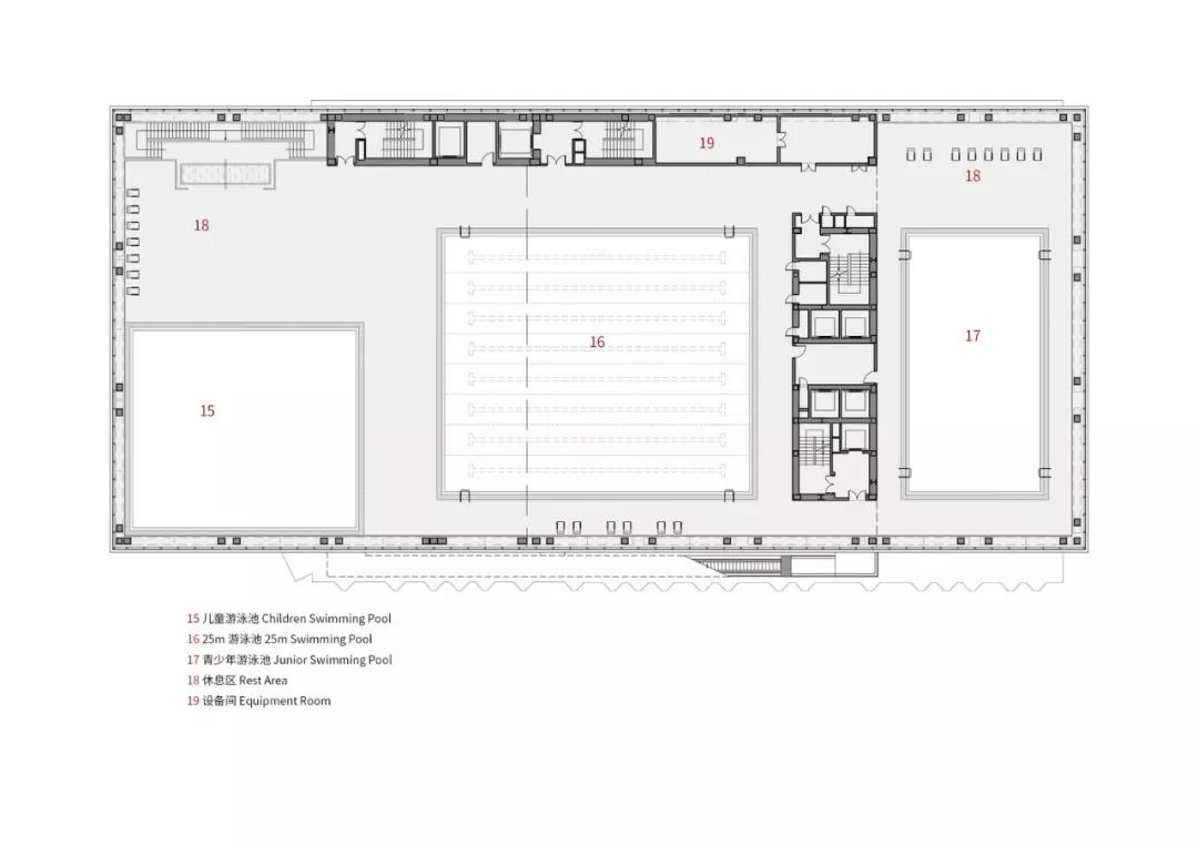 游泳館置于建筑體中部,其下方半開放休息區成為空中城市客廳??罩杏境夭坏珦碛袠O佳的城市視野,其自身突出的體量也成為城市景觀的一部分。最具活力的體育場館被放置在建筑的最高處,以最大限度減少對周圍環境的噪聲干擾,其下方的空中體育花園可作為居民熱身和戶外鍛煉的場地。