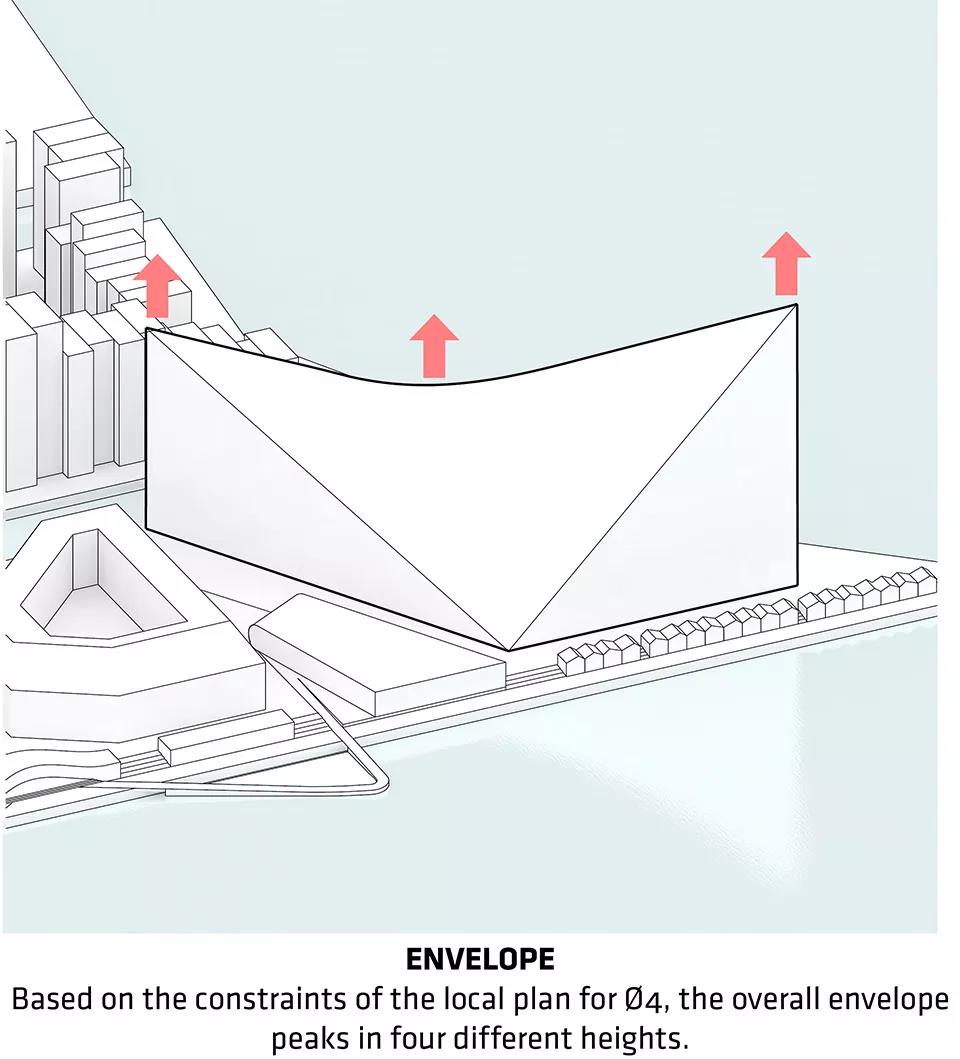 ▼基于人造島的場地限制條件,建筑的外圍結構擁有4個不同高度的頂點