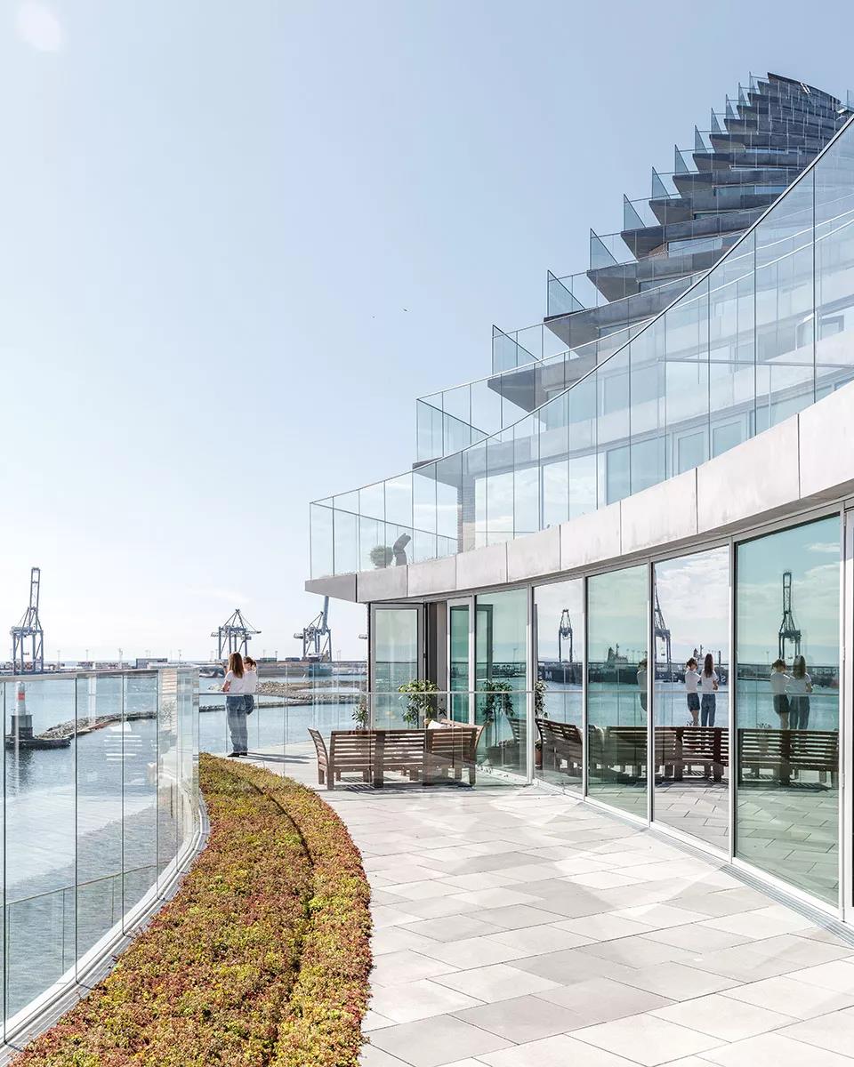 ▼寬敞的屋頂平臺、連續的陽臺、綠色庭院以及視野極佳的公寓共同創造出理想的生活模式,同時為港口和城市的天際線增添了活力