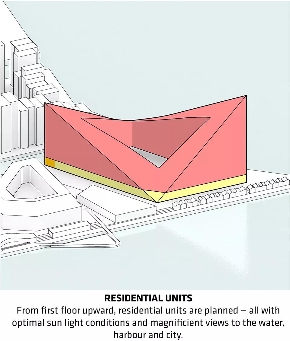 ▼建筑從二層起是住宅單元,均享有優越的采光條件,以及朝向海面、港口和城市的壯觀視野