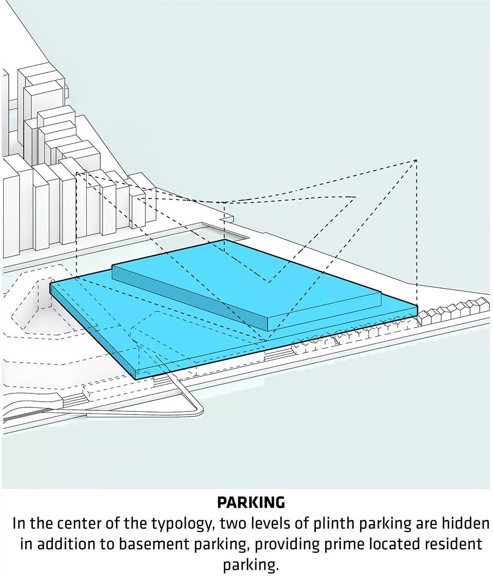 ▼停車場被隱藏在中央基座的前兩層以及地下一層,擁有極高的便捷度