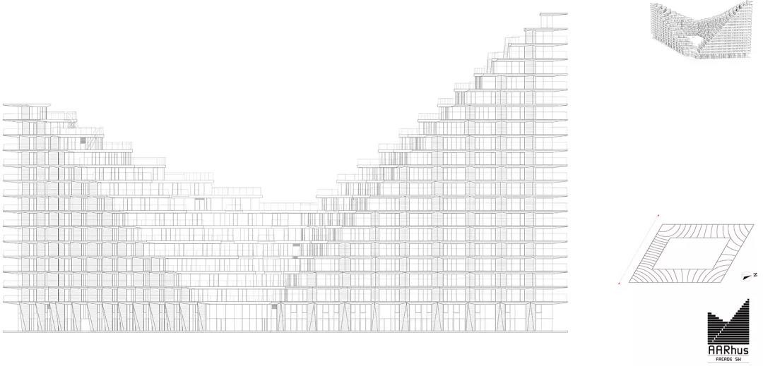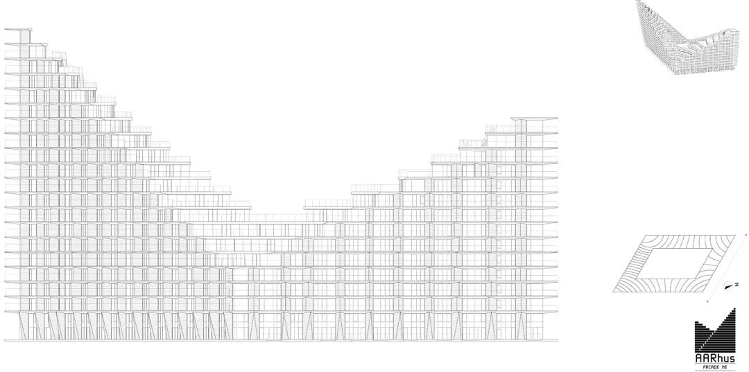 BIG的設計方案將奧胡斯既有城市體塊中最主要的建筑類型融合在一起,最終形成一個兼具了庭院建筑、連排住宅和塔樓特征的項目。建筑的每個角落都擁有不同的高度:階梯式的屋頂景觀創造出寬敞的私人露臺,為不同的樓層帶來戶外活動空間。