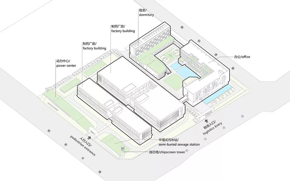 如何通過合理的規劃布局,在滿足生產、辦公及相關生活配套等不同功能正常使用的條件下,營造高效理性的生產工作環境和舒適活力的辦公生活環境,并以凸顯創新藥企業形象特色是設計的關鍵問題。