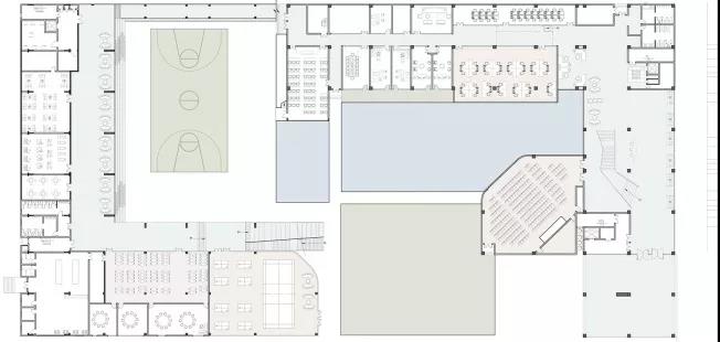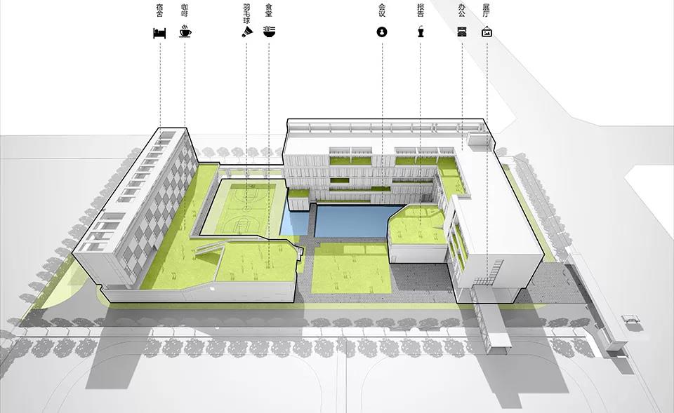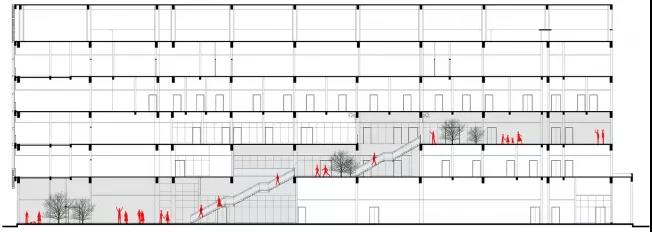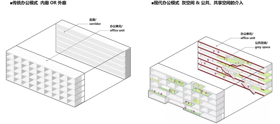 設計將辦公生活區的會議、培訓、展覽、體育、食堂、休閑吧等一系列的公共空間通過半圍合式的共享庭院有機串聯,結合庭院水景、景觀臺階、架空連廊、活動平臺、休閑露臺等公共空間元素,形成立體多元、層次豐富、生動有趣的社區型辦公生活的活力界面。辦公空間拒絕傳統辦公樓的封閉式內外廊布局,通過植入綠色邊庭、交通中庭,形成了辦公空間豎向上的流動,并與共享內院相互滲透,塑造人性化辦公模式和綠色活力空間形態。