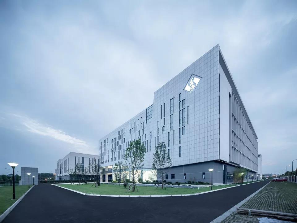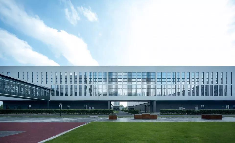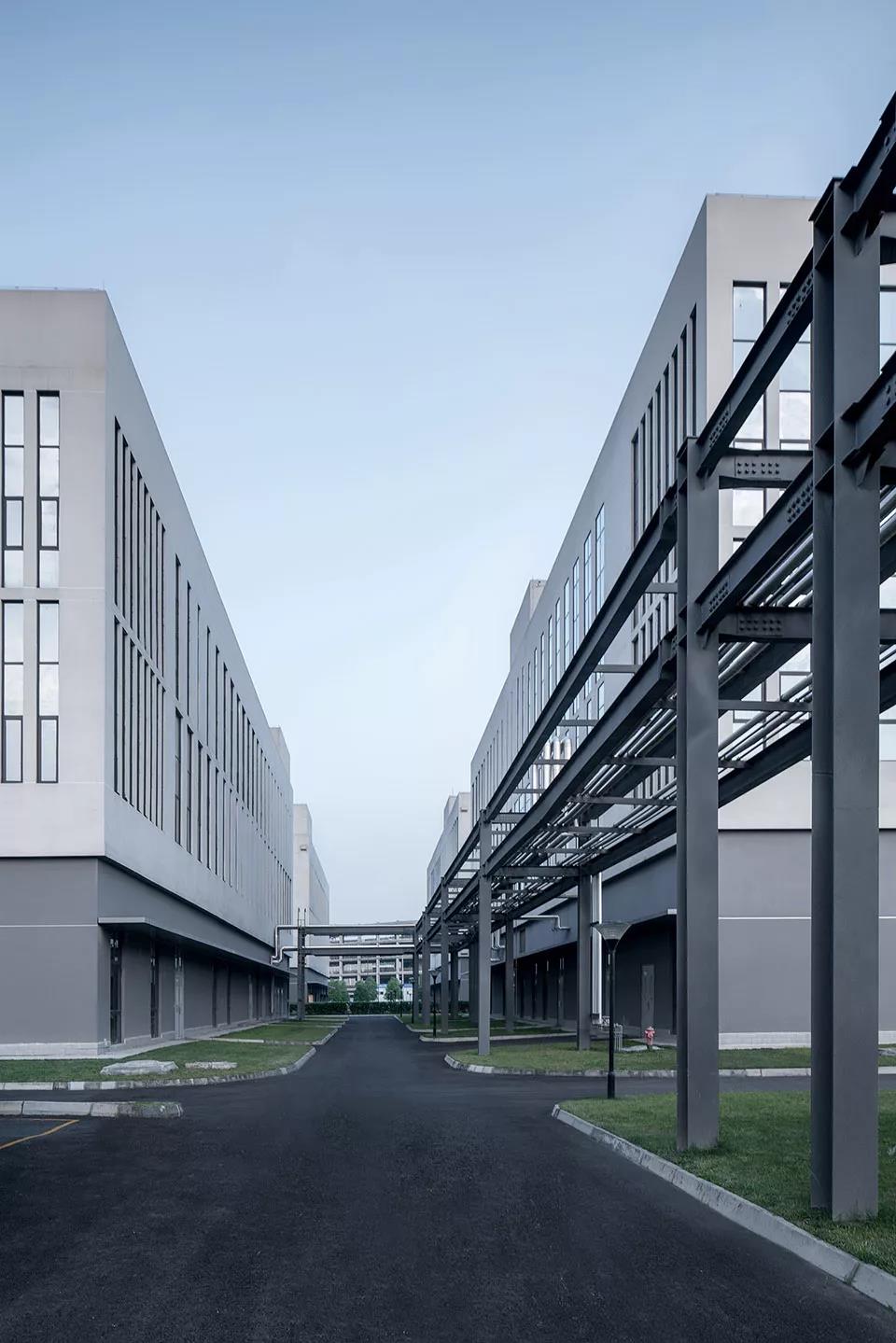 廠區附設的配套動力中心、污水站等設備用房,結合生態理念,化零為整,以消隱的地景化設計手法將其集中設置在用地西南側,形成了綠色屋頂花園,并將排氣煙囪結合苯環分子結構的立面肌理,形成廠區具有標志性的“微芯塔”。生產廠房以節奏性漸變的立面打破傳統廠房呆板形象,與外部橫向齊整的管廊構成了理性排列,并賦予了新的工業感和嚴謹的秩序精神。