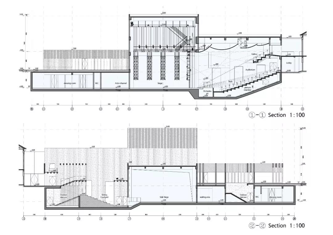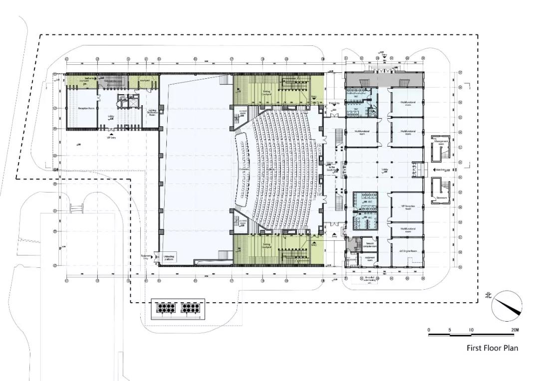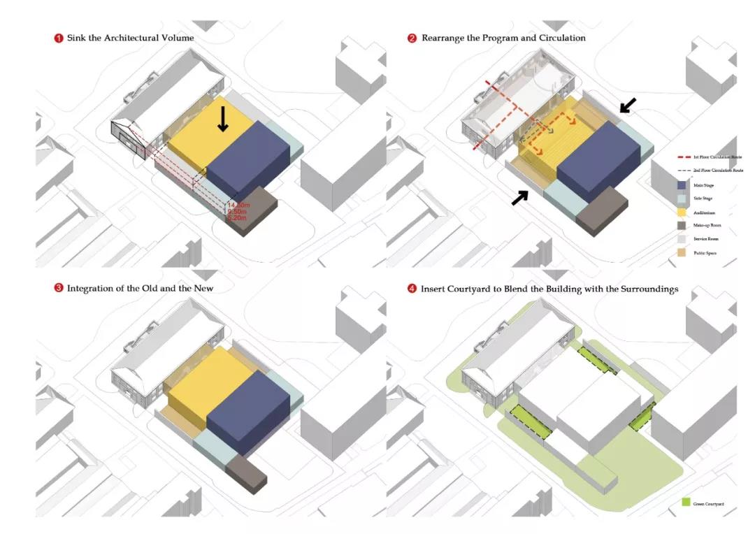 功能布局突破劇場前廳,觀眾廳,舞臺區(qū),分區(qū)過于明確的功能擺布方式,結(jié)合空間訴求,通過對新老建筑的連接和梳理,在建筑的底層及二層將不同形式的演出集會空間、公共展示空間、休憩交流空間功能充分融合,形成高效關(guān)聯(lián),公共開放的復(fù)合功能綜合體。