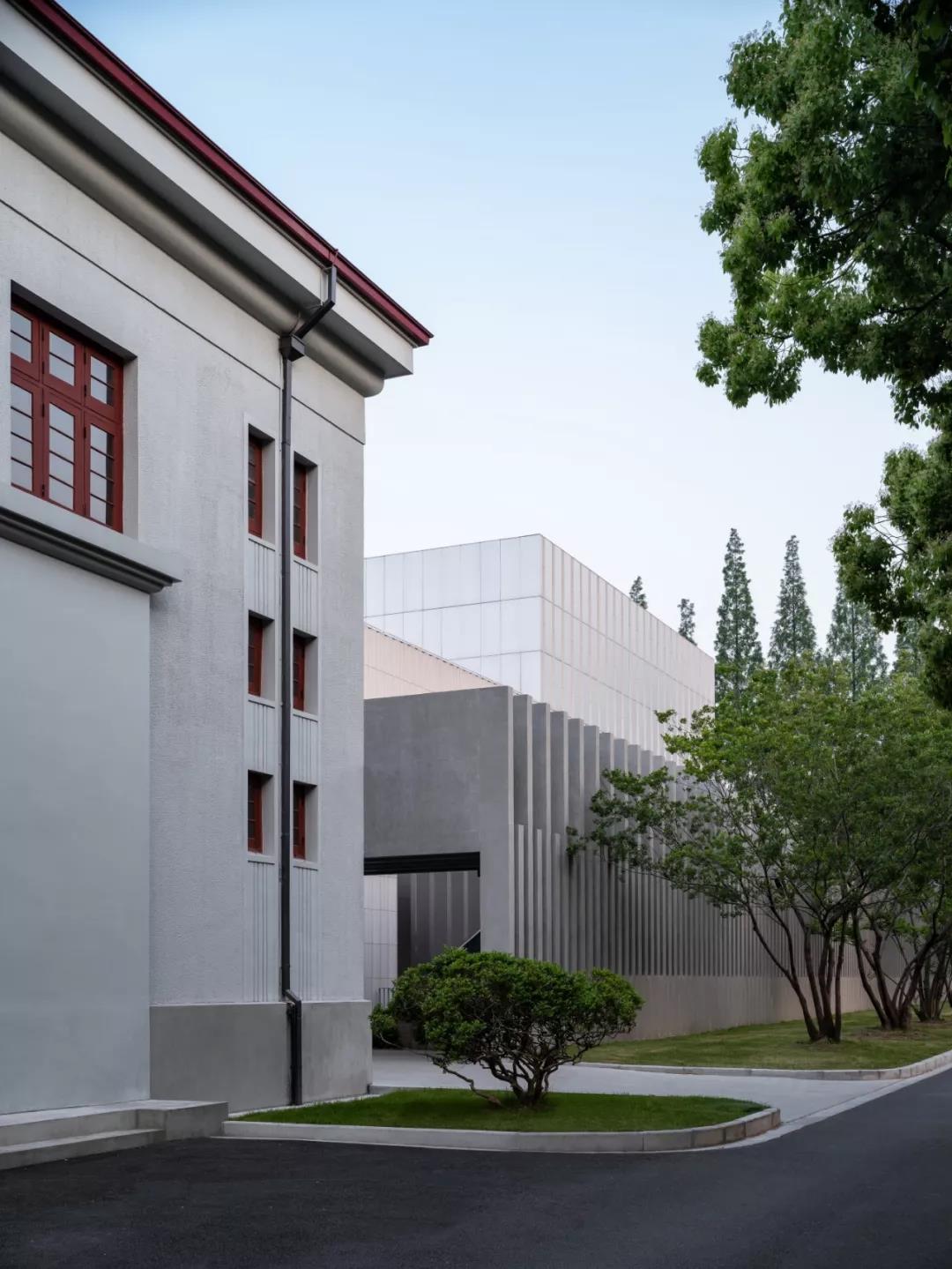 相輝堂位于復(fù)旦校園歷史風(fēng)貌區(qū),周邊相鄰多幢歷史建筑,新建建筑采用簡潔方整的外部形態(tài),溫潤低調(diào)的灰色陶板立面,清水混凝土的透空界面,以有限的方式介入既有歷史環(huán)境,以當(dāng)代建筑手法延續(xù)歷史空間文脈。